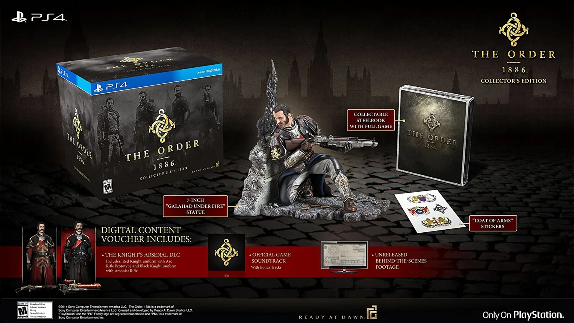 The Order: 1886 - Collector's Edition includes: 7-inch 'Galahad Under Fire' Statue. Collectable Steelbook, 'Coat of Arms' Stickers. Knight's Arsenal DLC. Official Game Soundtrack with Bonus Tracks. Unreleased Behind-The-Scenes Footage.