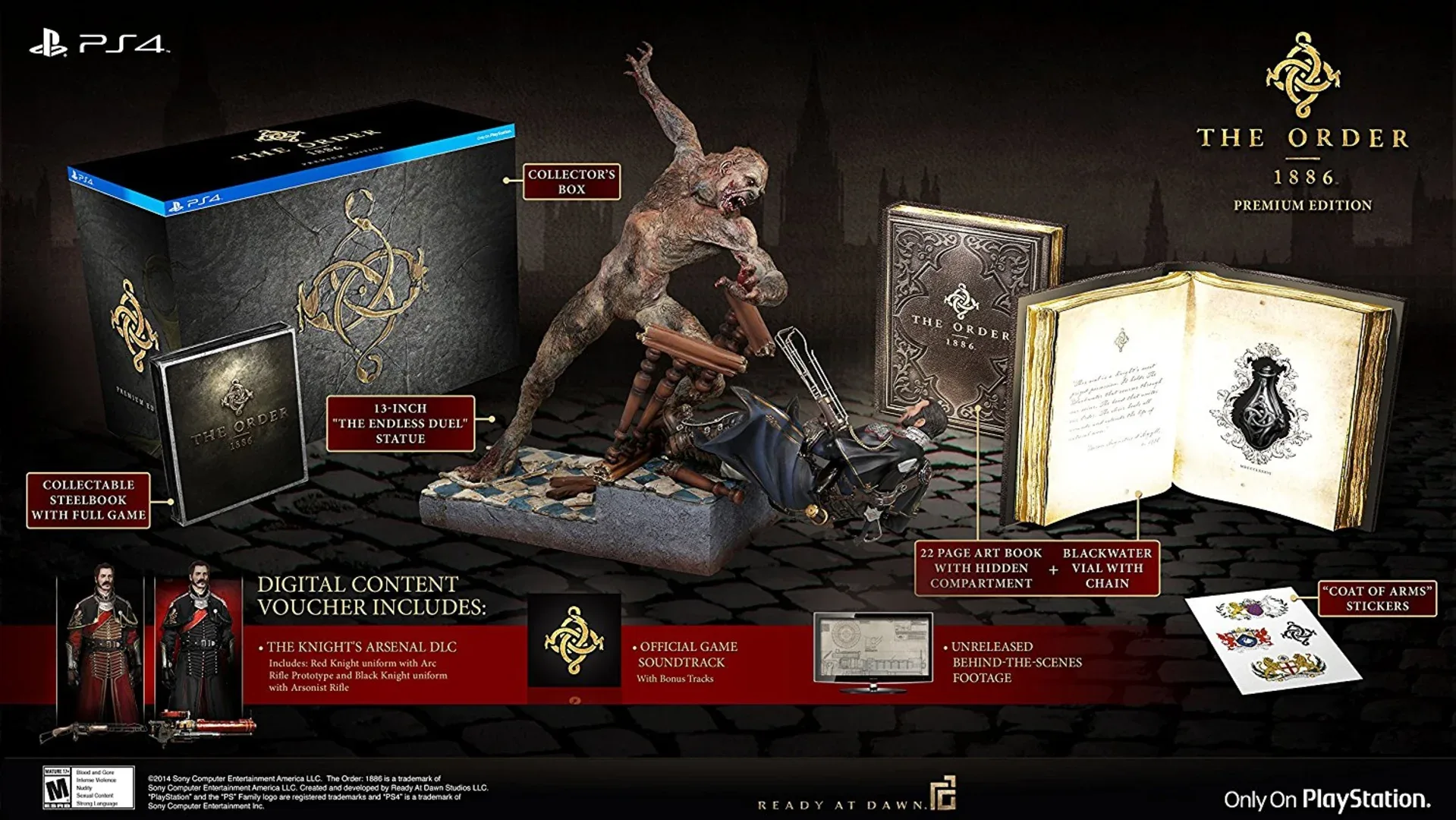 The Order: 1886 - Premium Edition includes: 13 inch "The Endless Duel" Statue Collectable Steelbook 22 page Art Book with hidden compartment + Blackwater Vial with chain "Coat of Arms" Stickers Pre-Order DLC (Knight's DLC) Official Soundtrack with Bonus Tracks Unreleased Behind-The-Scenes Footage