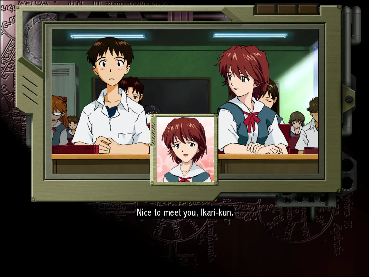 Fourteen-year-old Mana Kirishima (voiced by Megumi Hayashibara) is transferred to Shinji Ikari's school, and almost immediately they begin to establish a special relationship. This provokes much jealousy in Asuka, who also suspects that Kirishima is a spy who is trying to get information from Shinji about NERV and the Evas. Rei Ayanami is present but plays a rather background role in the story, though she seems to agree with the suspicions of Asuka. Gradually, a relationship between Mana and Shinji unfolds and they end up going on a date. It turns out, however, that Mana is one of three test pilots for the TRIDENT (alternatively named the "Country Crawler") units, a new competitor to the Evangelions, similar to Jet Alone; thus the name Girlfriend of Steel. Eventually, the TRIDENT goes berserk and the Evas have to destroy it. The interactivity in most of the game is limited to walking around areas until the next plot event is triggered. However, the one true branch occurs at the end of the game, where the player may choose to focus on Mana, Asuka or Kaji. This choice determines which of the game's three endings are shown, with a fourth exclusive to the PS2. In the Mana ending, Mana is discovered not to have been killed in the battle. Shinji rescues her and brings her back to his apartment. She showers, emerges wearing only a towel, and teasingly asks Shinji if he would like her to remove it (which she eventually does). In discussion with Misato, however, it is agreed that Mana has to leave Tokyo-3, and she says a teary goodbye to Shinji who has won her heart. In the Asuka ending, Asuka helps Shinji to get over Mana and the two children grow closer as a result. This ending contains romantic images of Asuka and Shinji together, including a moving scene where Asuka hugs Shinji emotionally. The third ending with Kaji does not focus on any one character as much as the other endings do. Mana is also discovered not to be killed, and says goodbye, with Shinji replying "I'll be waiting for you".