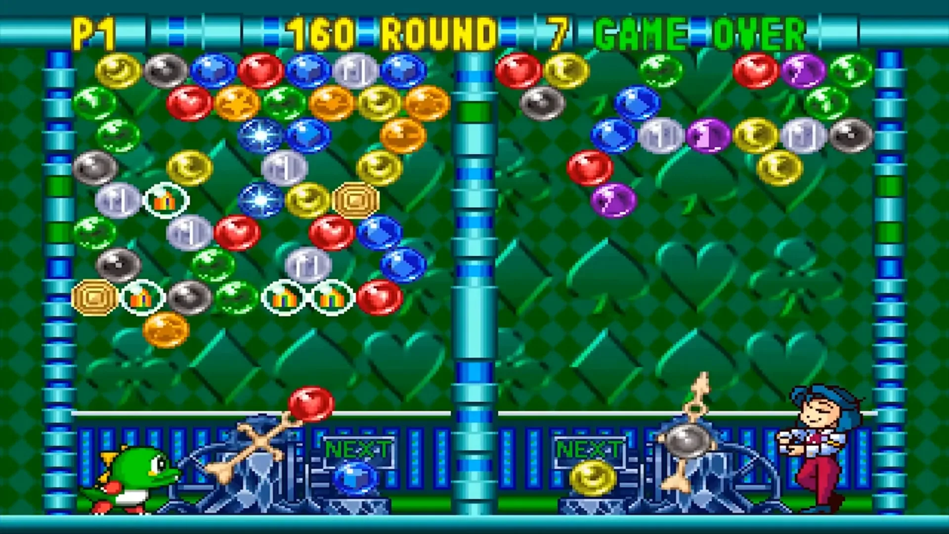 In the tradition of the Bust-A-Move series, Taito's Bust-A-Move '99 is a traditional puzzle game. The main objective is to destroy or get rid of (by dropping) all the bubbles located within the stage. Once you do this, you'll graduate to the next level. While the premise may sound simple, the logic and execution is not. Using a "bubble shooter", you must aim and shoot your bubbles to the top of the screen so that you can bring three bubbles of the same color together. When you do this, the bubbles will pop. One way to earn points is to have the popping bubbles as well as the bubble that was shot fall off the screen (in multi-player, it puts these bubbles on your opponent's side). This also gives you a lot less bubbles to take care of. Bubbles are constantly falling down. Popping them all in a short amount of time is necessary because the longer it takes you to pop them all, the faster they will drop. If you fail to clear out all the bubbles and they reach the bottom of the screen, the game is over. Bust-A-Move '99 contains some new options never seen in the Bust-A-Move series. There are now special bubbles (star, metal and rainbow to name a few), obstructive bubbles and blocks and new backgrounds. You are also given the opportunity to create your very own stages with the create-a-level editor.