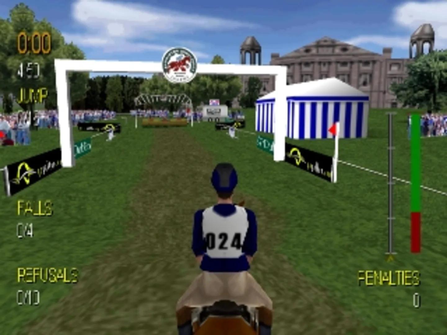 Equestrian Showcase puts players in the saddle of their favorite show horses at three of the world's most prestigious venues including the Kentucky Three Day Event, Badminton Horse Trials, and Burghley Horse Trials. A fourth event, the Sydney Horse Trials at the Sydney International Equestrian Center, can be unlocked by earning points during a full championship season at the other three venues. Events consist of three main challenges, Dressage, Cross Country, and Show Jumping, with specific scoring rules and penalties in each. The Single Player option includes five modes of gameplay: Championship, Three Day Event, Single Event, Practice, and Training. Four levels of difficulty (beginner, amateur, veteran, and expert) require 15, 30, 50, and 75 points (respectively) for qualification in the Sydney event, and players can customize rider set-ups in any mode by selecting horse, country, rider, and slot (four per country). All modes except Training and Practice accommodate multiplayer action for up to four separate competitors or in team events.