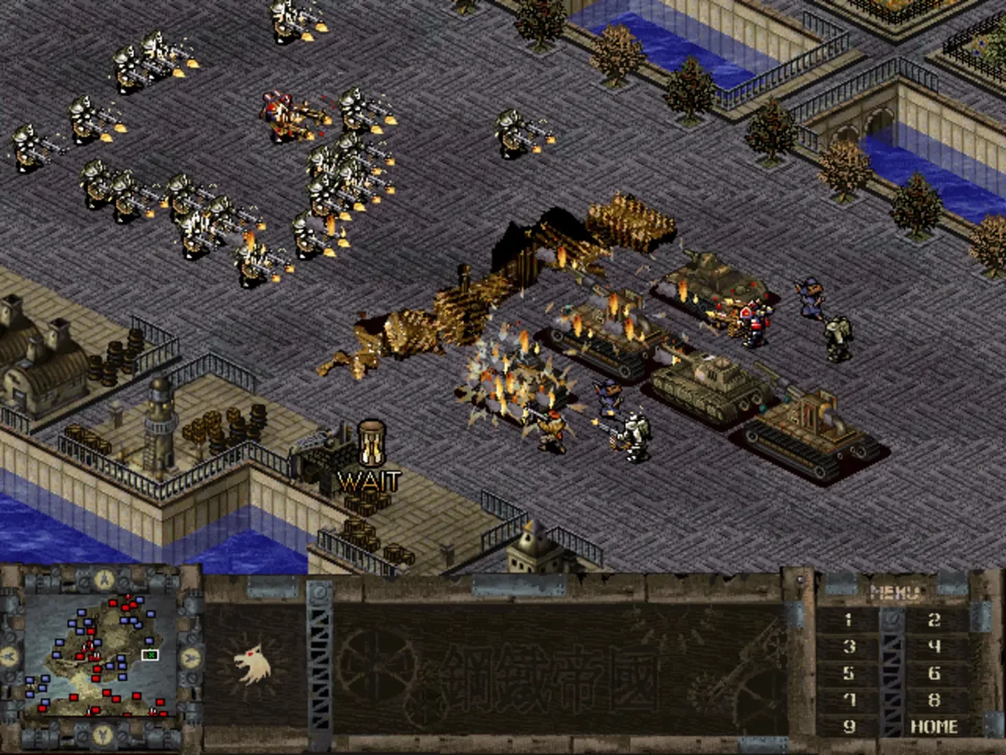 A Korean hybrid strategy game where the player moves around a map and manages units like in a RTS game while combat, when units on the map meet, is turn based. Units are made of a 3 by 3 grid with each section containing people or vehicles in various formations. The available formations for each unit is decided by the commander used for that unit. In combat each section can be given a target to aim at on the opposing side.