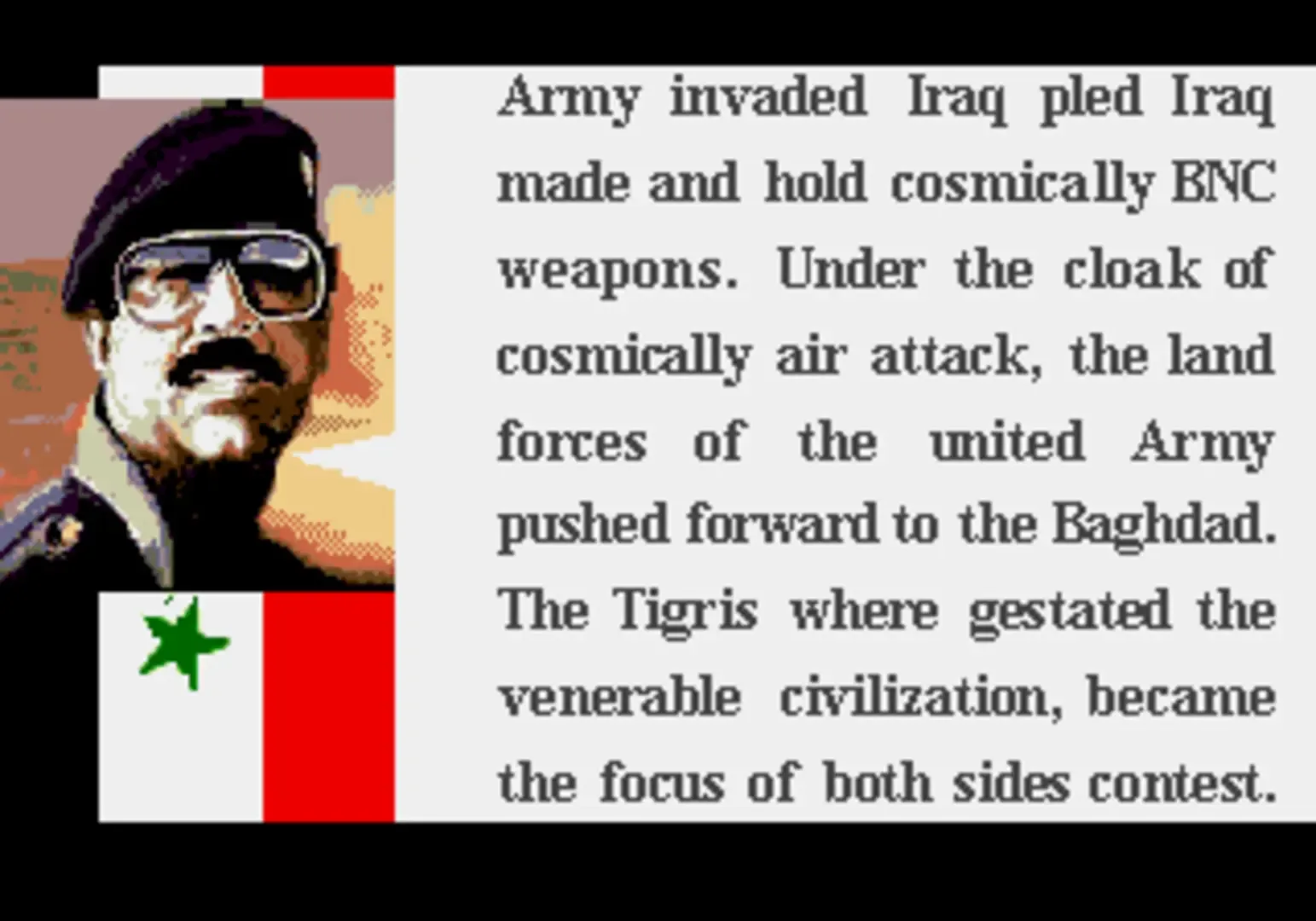 Iraq War 2003 is a pirated game made for the Mega Drive/Genesis by Tomsoft in 2003, based off the Iraq War.