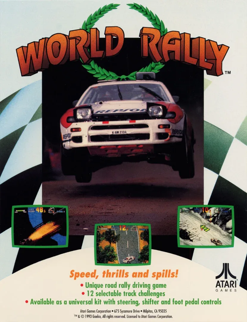 World Rally is a road rally-themed driving game. Licensed by Gaelco of Barcelona, Spain, it is suitable for both street and arcade locations. World Rally is a 1- or 2-player alternating driving game. Controls include a steering wheel on a mounting pod, a high/low gear shifter assembly, and an accelerator pedal. Players select 1 of 4 rallies to start, each progressively more difficult than the one before. A rally is composed of three stages, offering a variety of different track layouts and road surfaces. Asphalt, dirt, night driving and snow-covered roads require players to adjust their driving skills accordingly. Players maneuver their way through hairpin curves, jumps, bridges, puddles, and other obstacles. Completing each stage within the 60-second time limit allows players to advance to the next stage for free. After the finish of each stage, and at the completion of all 12 stages, players' times are displayed and compared with other top drivers. It became notable in recent years due to being extremely difficult to play on emulators like MAME, as the arcade hardware implemented an advanced anti-piracy system until Gaelco co-founder Javier Valero provided unencrypted keys for the PCB in 2008 at a Spanish gaming conference, allowing it to be emulated and played. Gaelco later made its ROM image available as freeware.