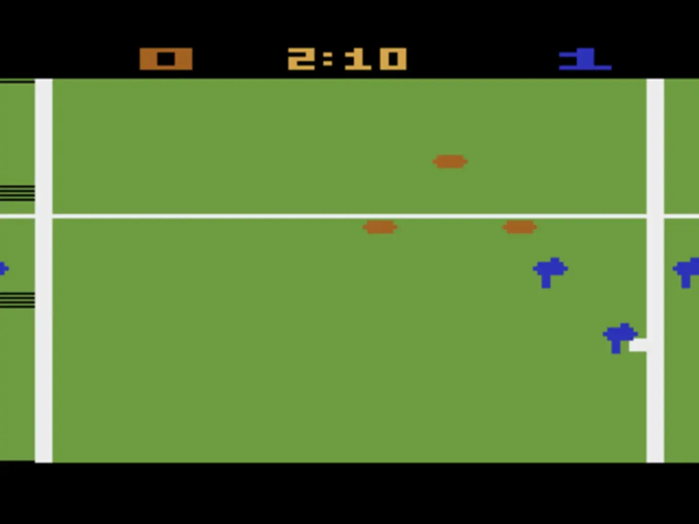 Championship Soccer is a soccer game where each team has one forward, two backs and a goalie. The forward and backs always run in formation. You only control the goalie when he has the ball, otherwise he is computer controlled.