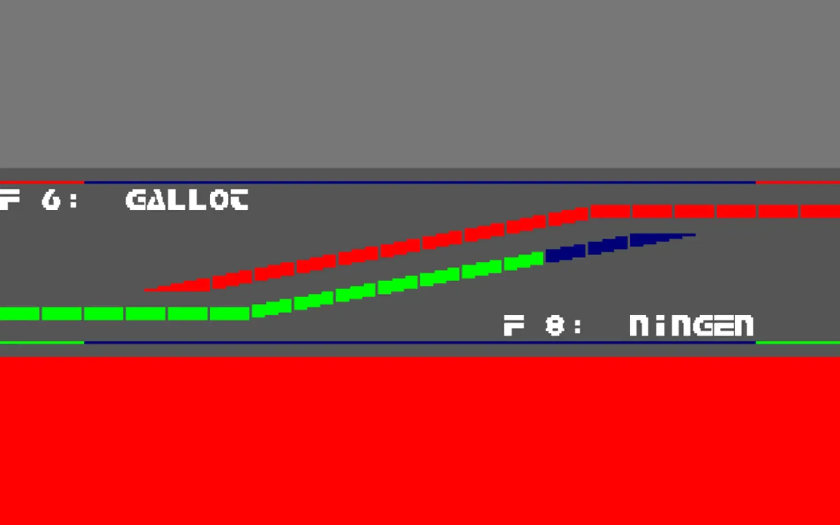DIRES (Digital Image Real-Time Energy Simulation) giger・loop is a 3D action game in which players steer aircraft and need to topple poles. Gameplay is divided into 2 parts. The first part has players place poles with the opposite color in the looping field. The status bar will deplete and show players how many poles they can place. The second part starts as soon as all the poles are placed. In this part, players need to topple poles of their color while avoiding their opponents poles which they've placed in the first part of the game. In this part, the status bar will increase after the players topple the poles of their color and if the player's aircraft is slow, the poles will bounce their aircraft back.