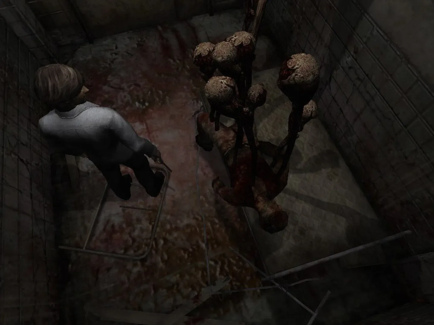 Silent Hill 4: The Room is the fourth installment in the Silent Hill survival horror series. The game is similar to the past entries in terms of atmosphere, never letting the player know what's behind the next corner or down the street. Aside from the traditional third-person-view, there is now a first-person mode which is used to control the main character when he is in his apartment. Objects that can be interacted with are highlighted by eyeball icons. The previous games in the series have mostly been about exploring the town and solving puzzles, but this installment has much more combat involved. There are more enemies in a given area, spread in cramped spaces. The main character mostly uses a standard Silent Hill arsenal of weapons, such as the steel pipe, pistol and a golf club.