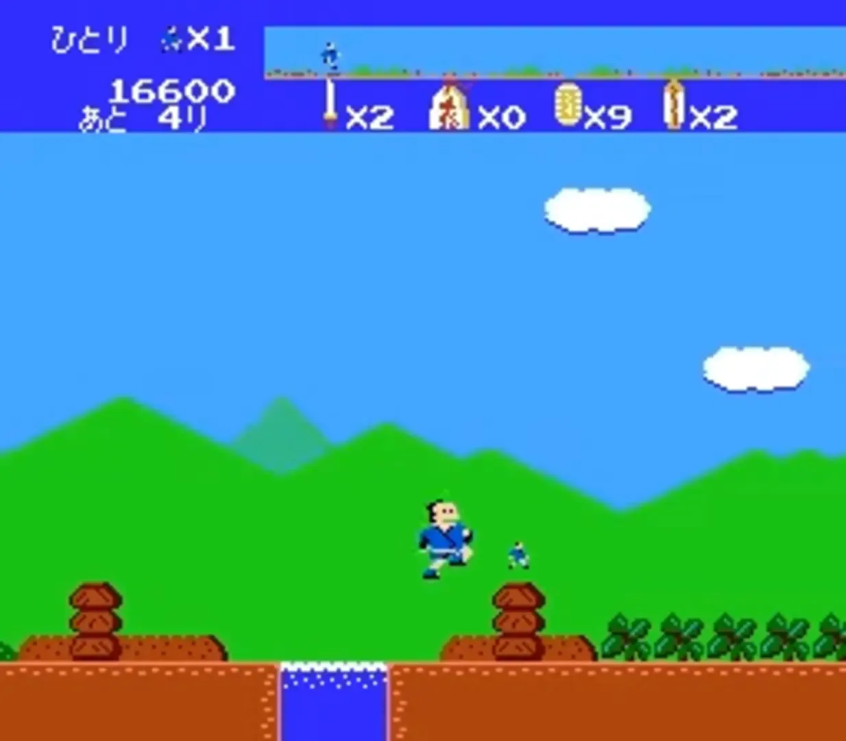 Although commonly referred to as Toukaidou Gojuusan-tsugi, the full name of the game is Kanshakudama Nage Kantarou no Toukaidou Gojuusan-tsugi, which can be roughly translated as "explosive throwing Kantarou and the 53 stations of the Toukaidou". To further explain the main character's name is Kantarou, and he throws bombs at his enemies. He is attempting to travel from Kyoto back to Edo (known today as Tokyo) to see his girlfriend Momoko. To get there, he is traveling through the Toukaidou highway which is composed of 53 checkpoints along the way. However, an unscrupulous merchant is attempting to capture Kantarou and steal his explosive technique secrets. Toukaidou Gojuusan-tsugi is a horizontally scrolling action game developed by Sunsoft in 1986. It was never released outside of Japan. On June 29, 2001, the game was released for the Windows platform as part of Sunsoft Classic Games 2 along with Ikki (which was itself rereleased as a budget title in 2004). On December 27, 2001, the game was released on the PlayStation as part of Memorial Series: Sunsoft Vol. 3 along with The Wing of Madoola.