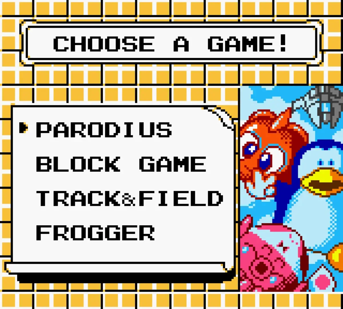 The Konami GB Collection is a series of video game compilations for the Game Boy Color. The compilations were originally released from 1997 to 1998 in Japan for Game Boy, and were later released in Europe in 2000 for Game Boy Color. Included in Volume 2: - Parodius - Block Game (Quarth) - Track & Field - Frogger This was released as Volume 4 in Japan.