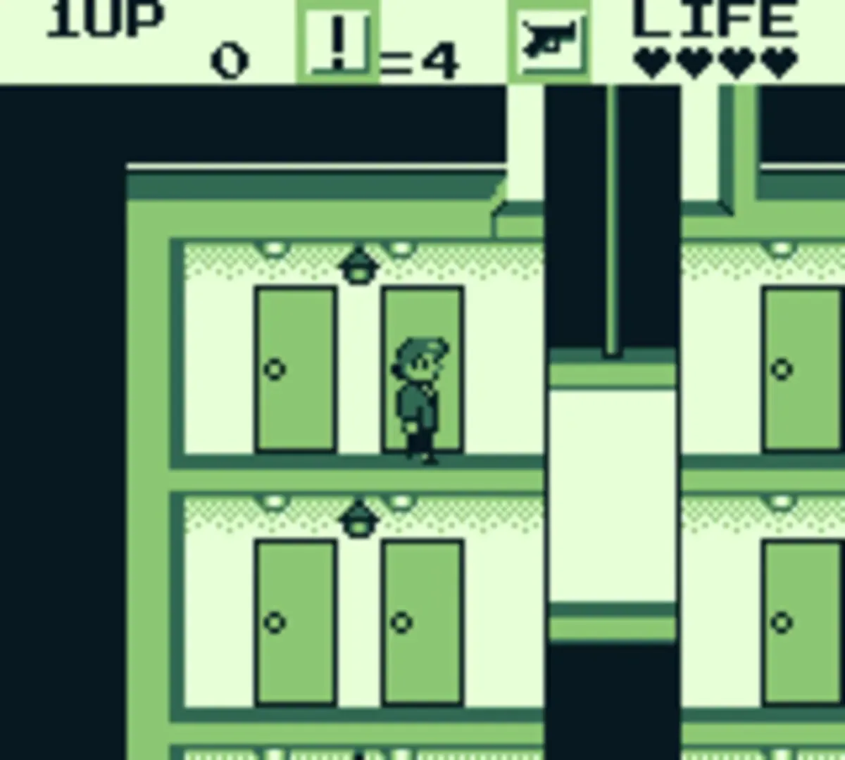 You are Agent 17 (codename: "Otto"). Your mission is to secure all top secret documents from a security building and escape in the getaway car, located in the basement of the building. Gameboy version of the Arcade game "Elevator Action".