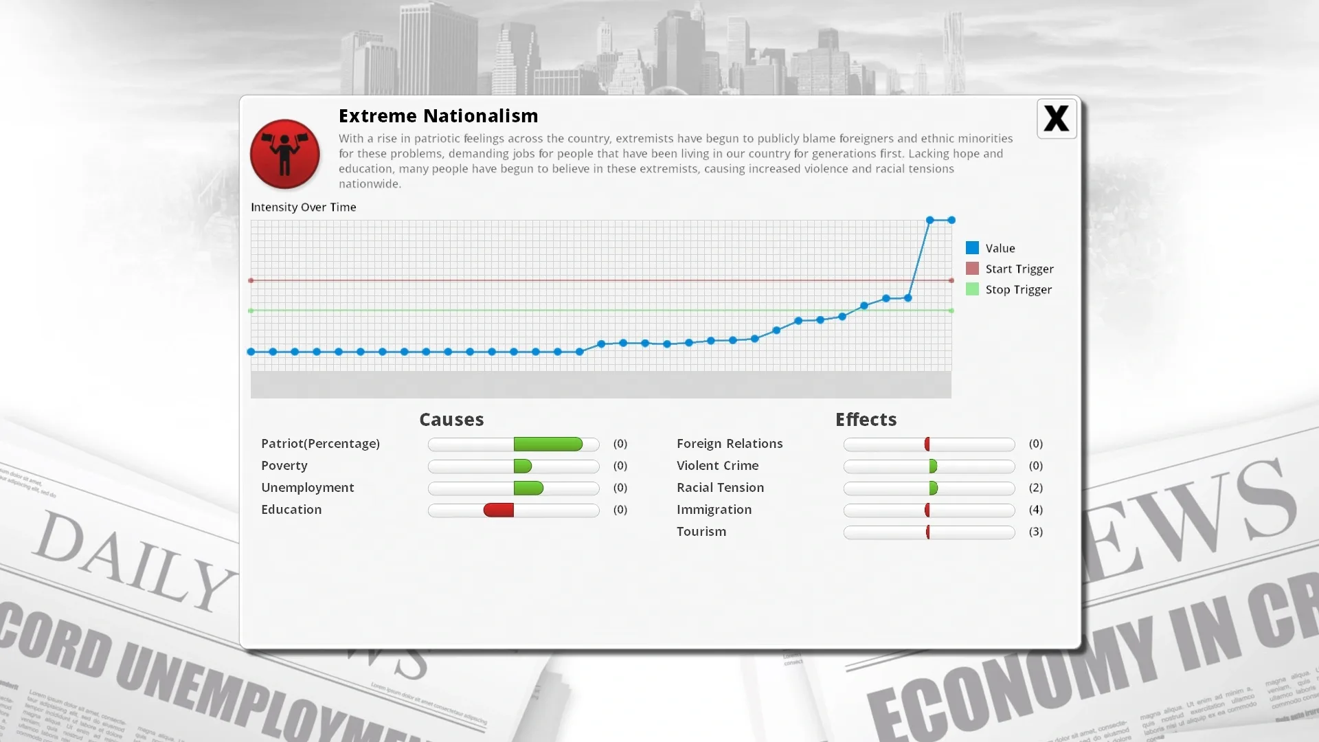 This expansion for Democracy 3 adds 33 new situations and policies that reflect the more extreme side of politics, all within the framework of a democracy. Fed up with just adjusting taxes and government spending in the conventional sense? Perhaps you think your people need the national anthem sung at the start of every news broadcast?
