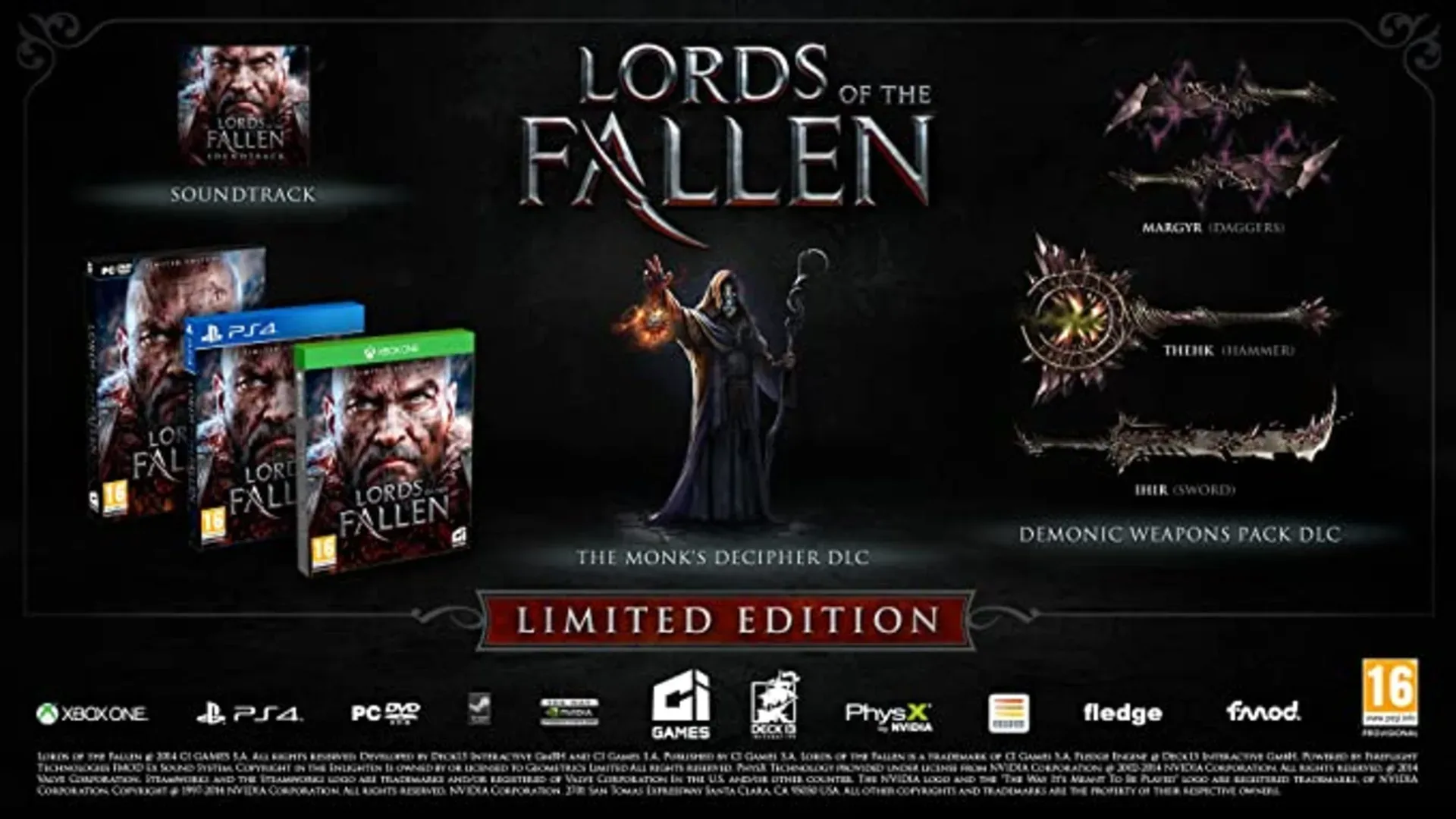 This edition includes: -The Monks Decipher DLC offers more single-player action, uncovering hidden secrets throughout the three worlds Harkyn explores in Lords of the Fallen - The Demonic Weapons pack includes three devastating new weapons - Soundtrack