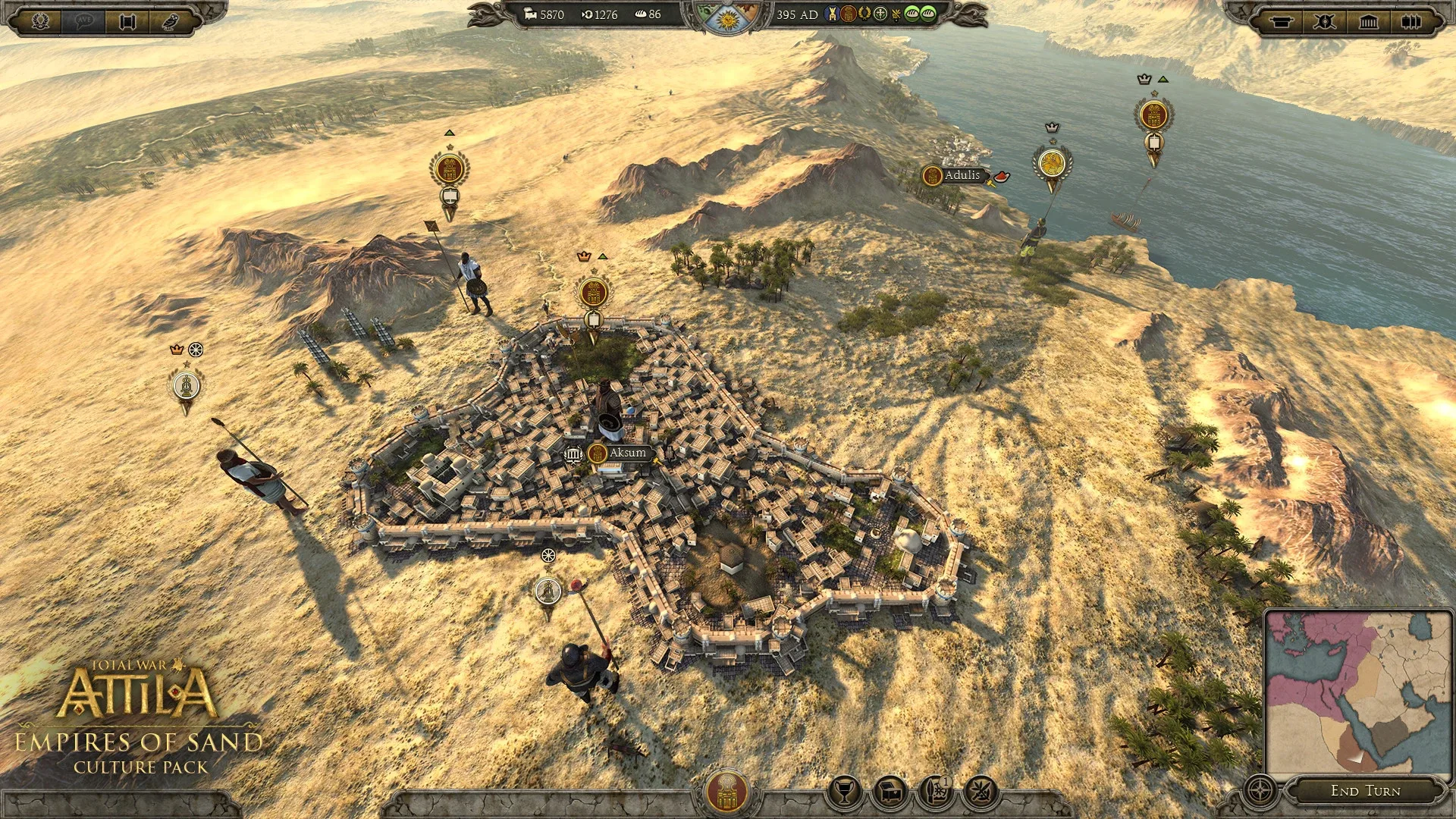 The Empires of Sand Culture Pack brings three new playable factions and new religion features to Total War: Attila. Aksum, Himyar and the Tanukhids may be used in Single or Multiplayer Campaign modes and Custom and Multiplayer battles.