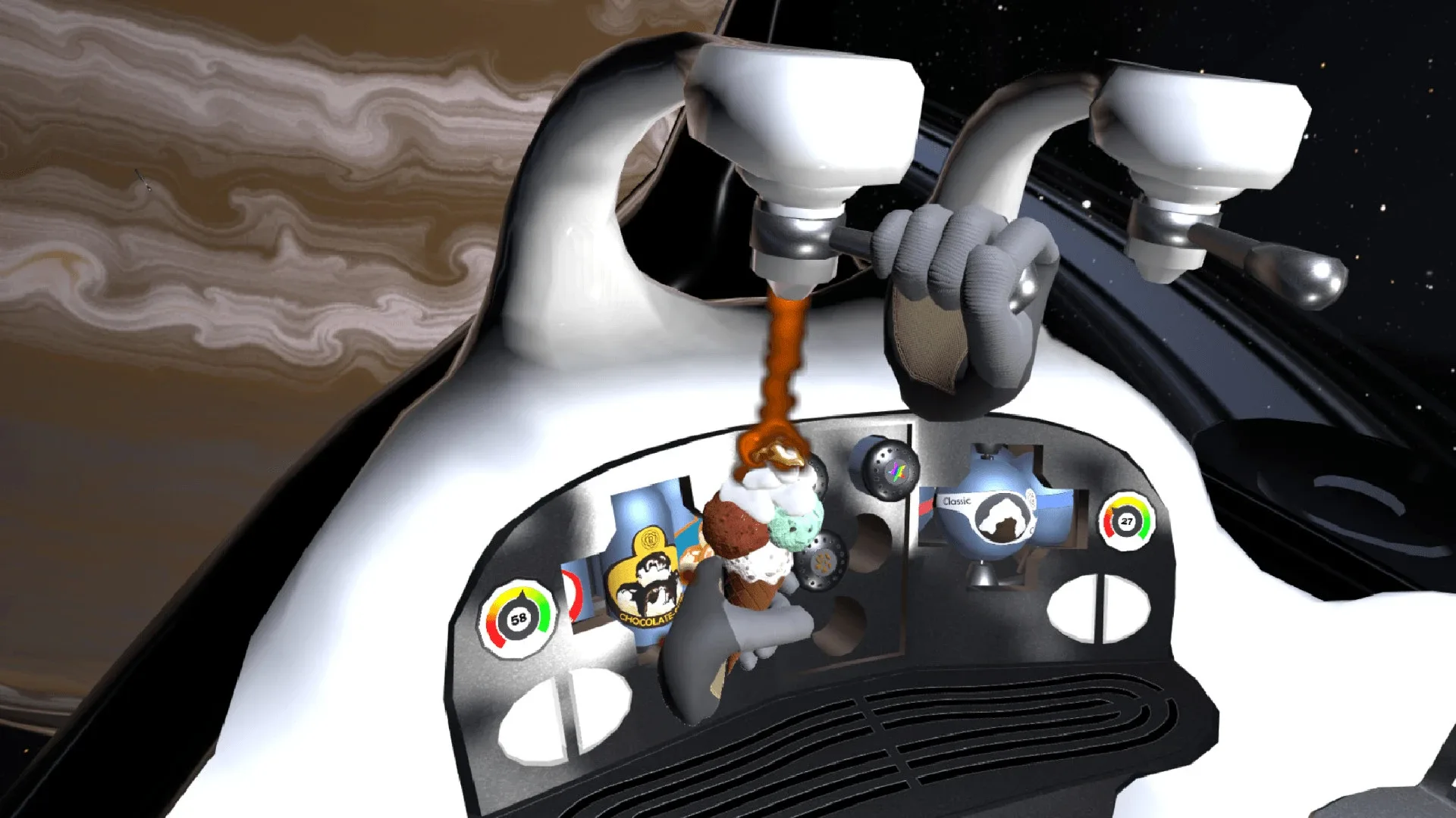 Rosebaker's Icy Treats is a virtual reality game that sends you into space to sell ice cream! You’re in charge of Rosebaker’s mobile ice cream parlor, selling their famous icy treats to travelers in transit from around the galaxy!