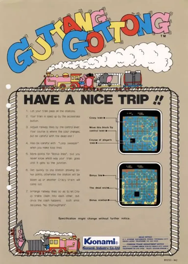 Loco-Motion is basically an updated version of a sliding block puzzle game where the player can move pieces horizontally or vertically within a frame to complete a picture. However, the presence of a constantly moving locomotive complicates matters. The player controls the playfield and the aim is to guide the locomotive around the tracks to collect the passengers waiting at the stations located around the edges of the screen. The player uses a joystick to slide a piece of the track into the vacant square. The locomotive is always moving, but the player has the option of making it move faster to get to the passengers more quickly by using a button next to the joystick. The player must avoid crashing the locomotive into the dead-end barricades (shown as a yellow 'X'), and also ensure that it does not run into the edge of the gap or a barrier at the playfield edge, either of which costs a life.