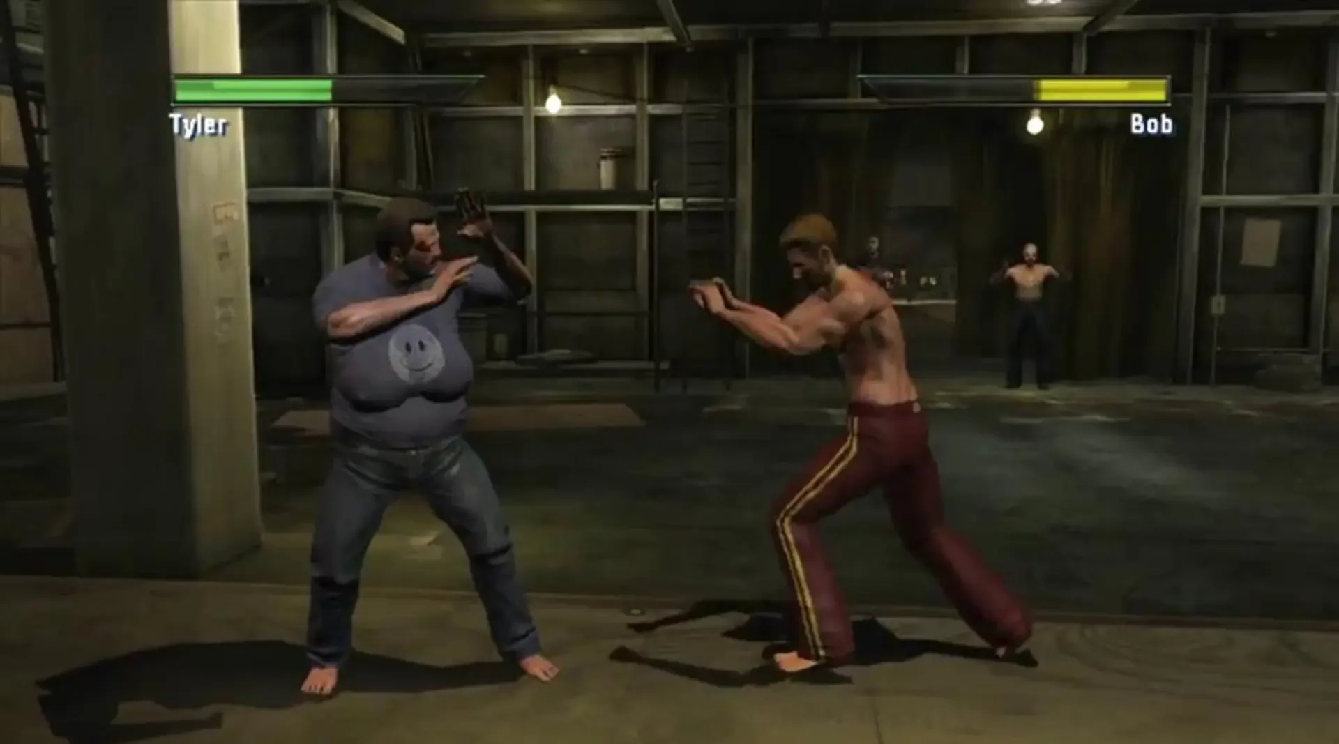 Fight Club is based on David Fincher's film adaption of Chuck Palahniuk's novel of the same name. Fed up with consumerist American culture, a fight club is founded as a new type of therapy through bare-knuckle fighting. The game focuses on the fights and uses many characters and environments from the original story. You can create a new fighter or clone one of the generated characters. There are three general fighting styles to choose from: grappling, kung fu or brawling. The moves range from basic punches to devastating moves with broken bones, ripped clothes and real-time facial deformation. After each successful fight, you earn Character Development Points (CDP's) which can be used to upgrade or heal your character.