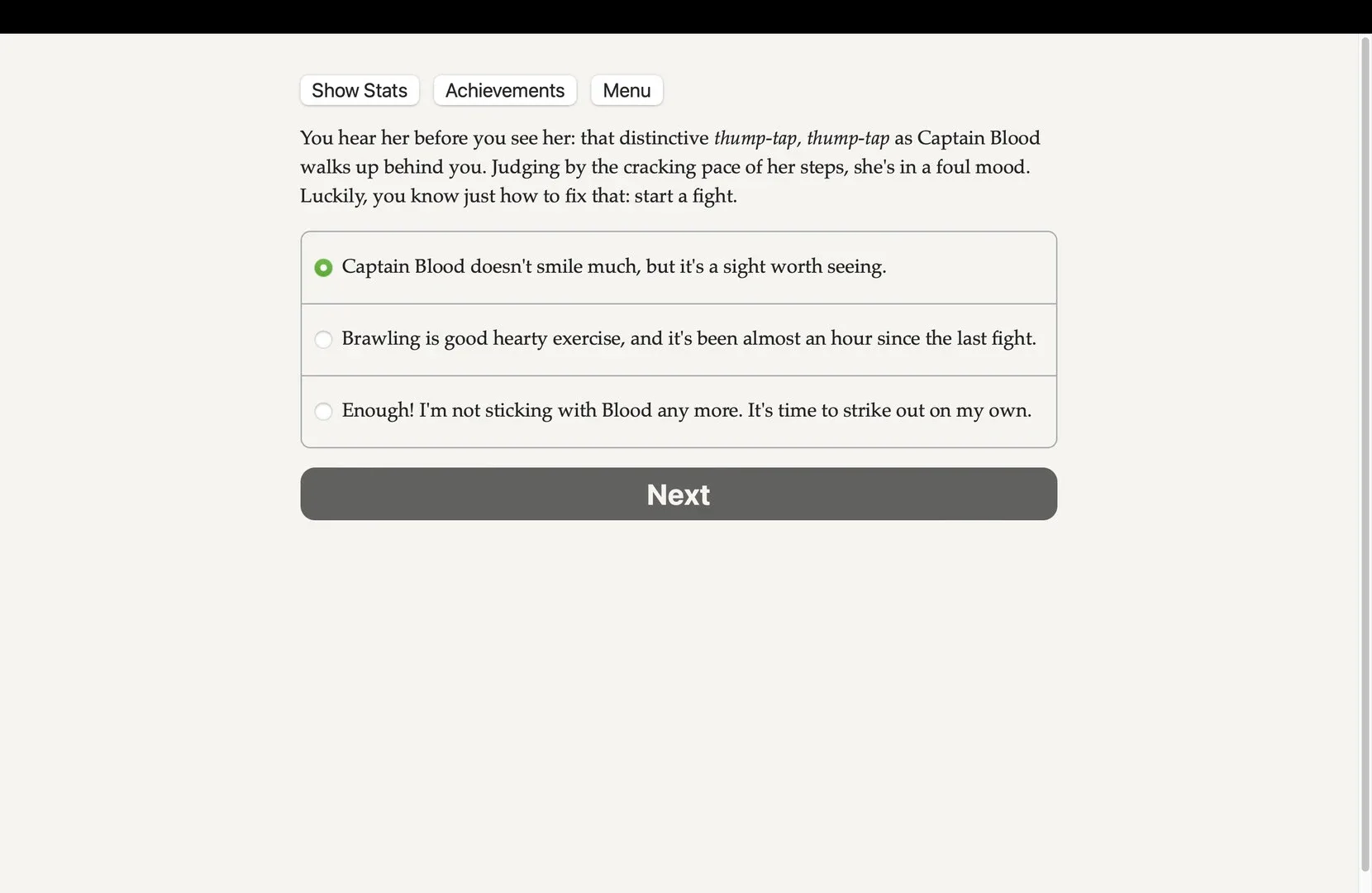 Hoist the Jolly Roger and set sail to find the legendary Titan’s Treasure! Do you fight with a cutlass or with magic? Are you biding your time until you can shoot your captain in the back, or are you the reason the rum is gone? A game written by Felicity Banks for the 21st Annual Interactive Fiction Competition.