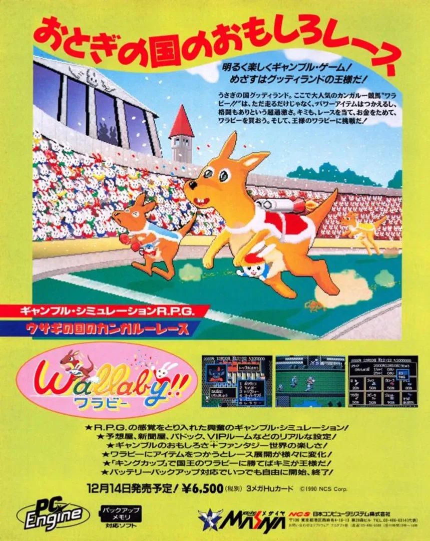 In this game the player bets on races. The twist is, the racers are wallabies. They also have rabbits in their pouches. The game takes place in a world largely inhabited by the said rabbits, but there are other animals, such as koalas who serve as bookmakers. The game also features managerial elements, as the players must manage their racers. The player can choose to play as one of four rabbits and name them. The racing itself is non-interactive, the only option being to change focus from one wallaby to another. The player can watch a race whether they've made a bet or not.