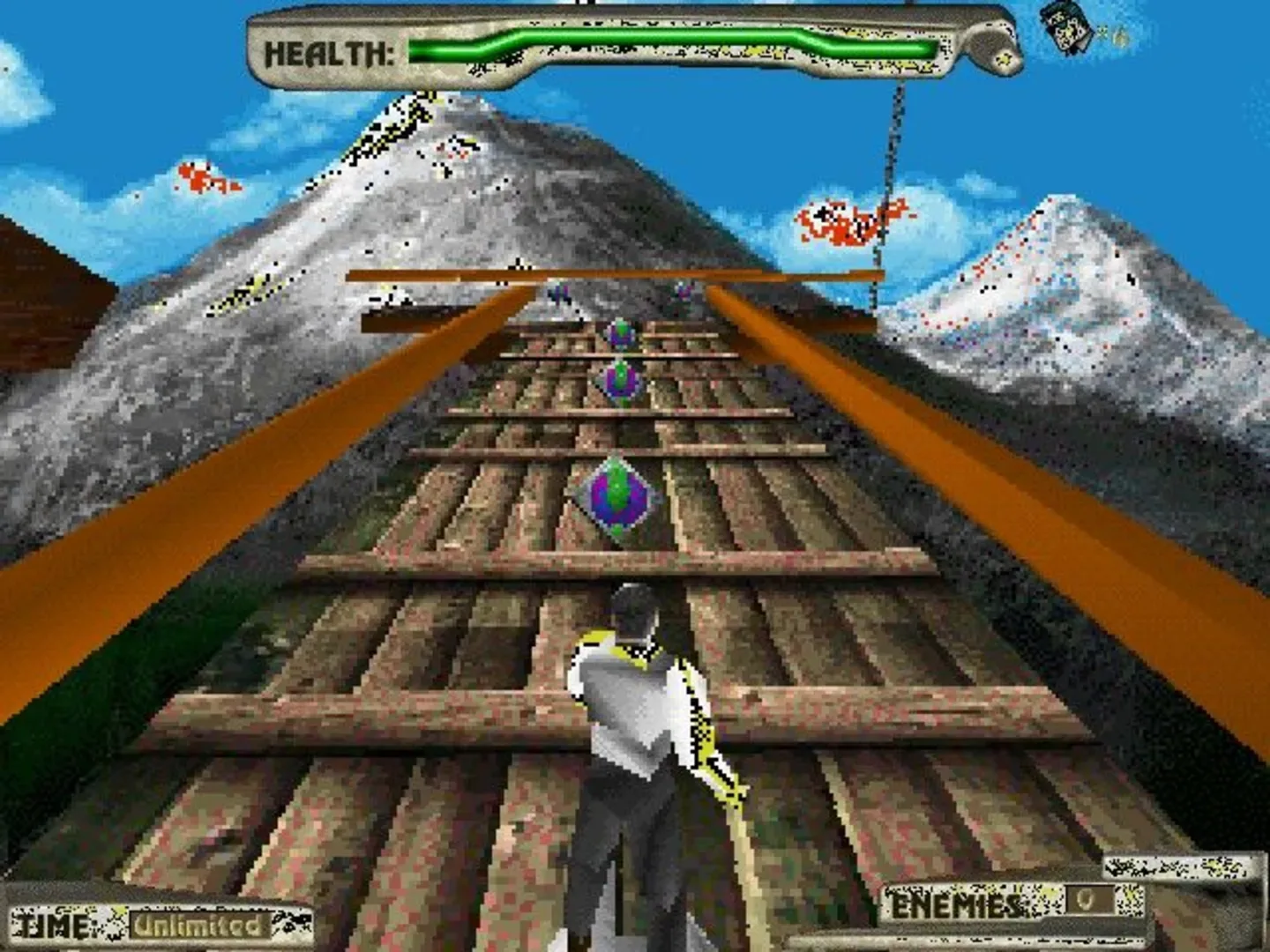 SoulTrap is a 3D platform game that takes place inside the mind of the main character of the game: Malcolm West. The fears and anxieties of Malcolm West are represented by strange often moving platform structures high in the sky. The player has to jump from platform to platform, shooting phobias taking the form of enemies and outwitting obstacles that he comes across. The game comes with 11 levels with each their own graphical theme. The player can find various weapons such as a magical axe, a .45 automatic and a grenade launcher. There are also power-ups that allow the player to replenish health and ammunition. The game allows the use of both first person and third person camera angles.