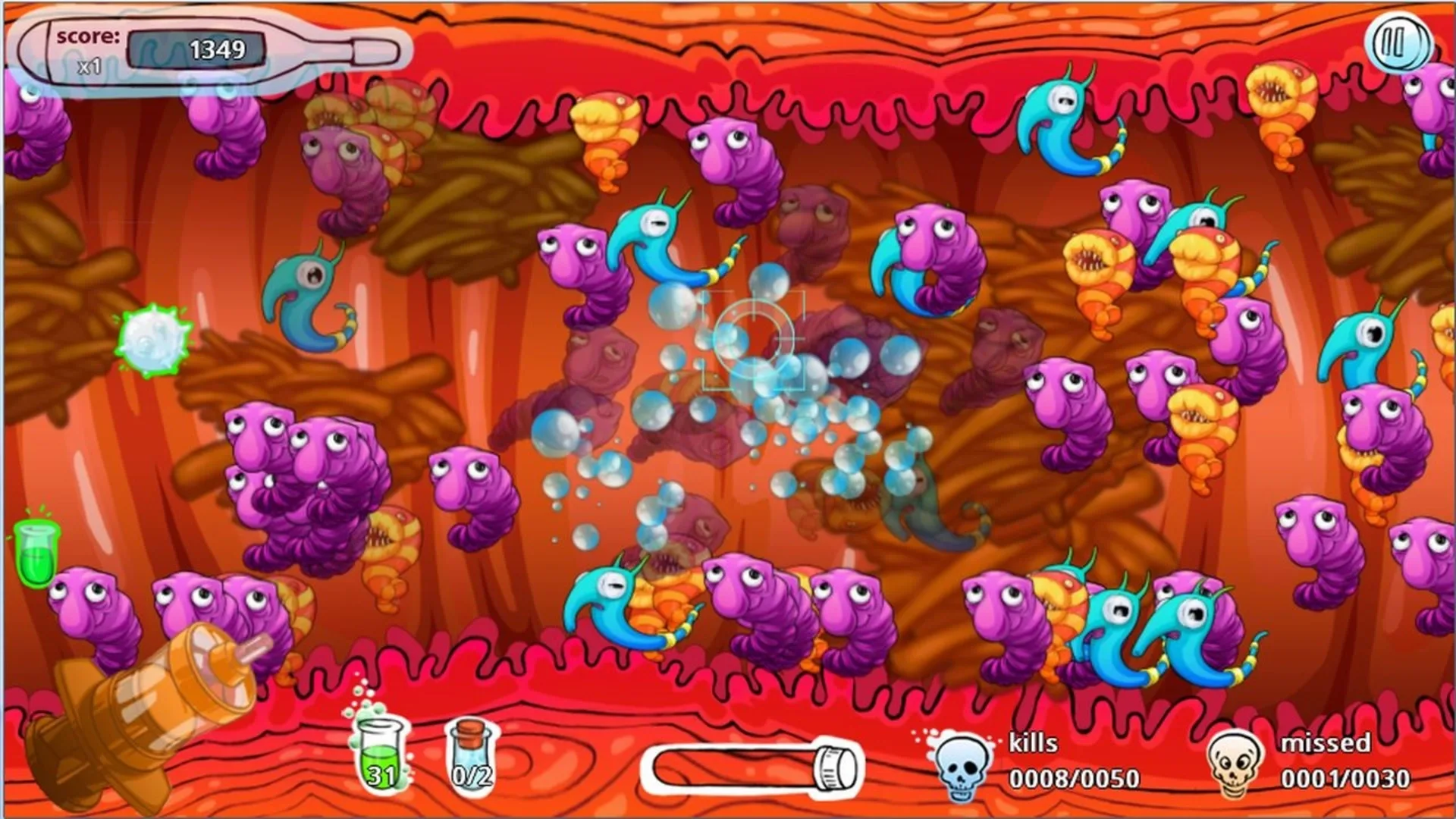 "Medical defense" game where the player takes control of a syringe-styled turret inside a human, trying to defend him against the horde of microbes out to end his life.