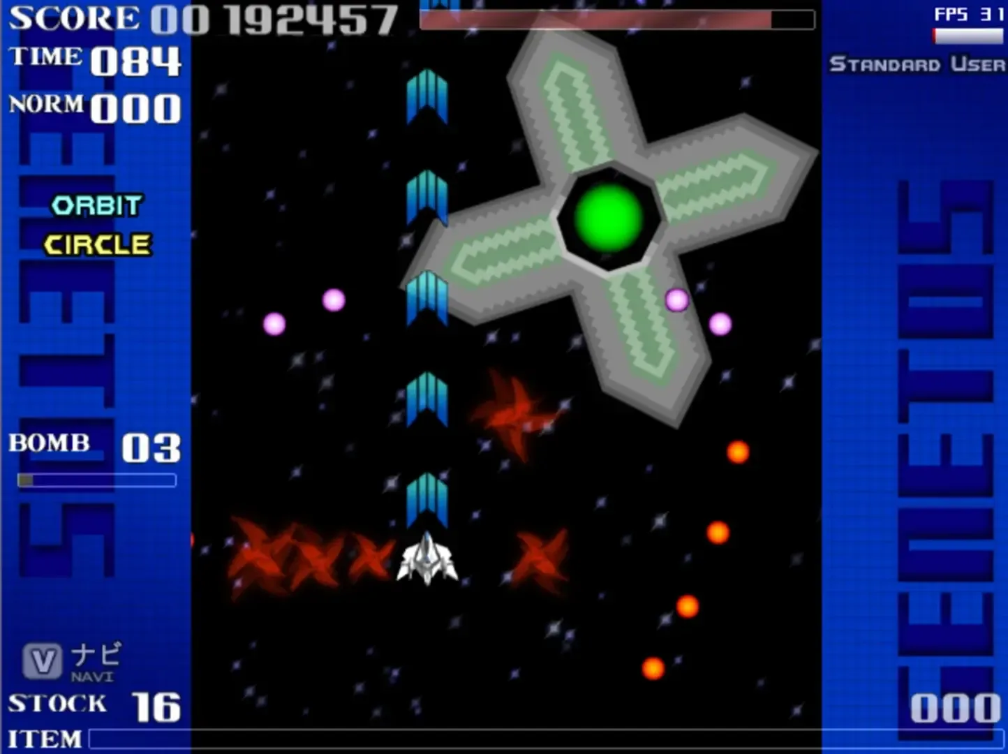 Genetos is a Japanese freeware game by Tatsuya Koyama that explores the history of the Shoot-em-up genre through play.