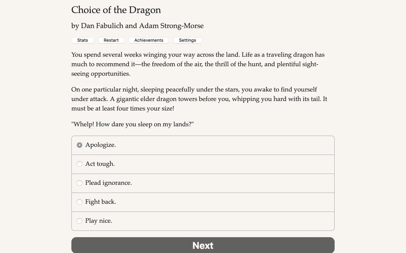 Text-based, multiple choice, RPG for the iPhone. You're a dragon, how cool is that?