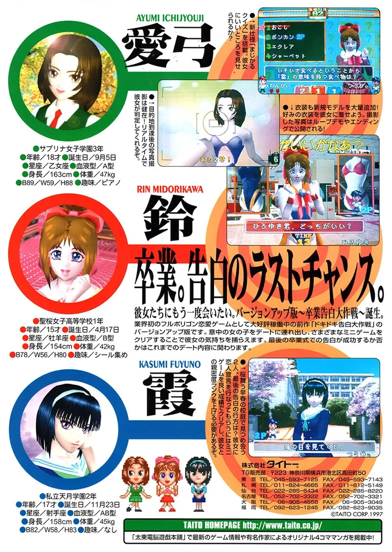 Magical Date: Sotsugyo Kokuhaku Daisakusen is a skill game and dating sim published by Taito in 1997, as an updated version of Magical Date: Dokidoki Kokuhaku Daisakusen. In this game, the player picks one of three possible girls to date and then starts off in a square as in a board game, proceeding to other squares which have different mini games. At junction points the player is asked questions about their date and has to pick the correct answer, or she will become upset Released in February 1997 in Japan only. The subtitle of this game translates from Japanese as 'Cruel Graduation Tactics'.