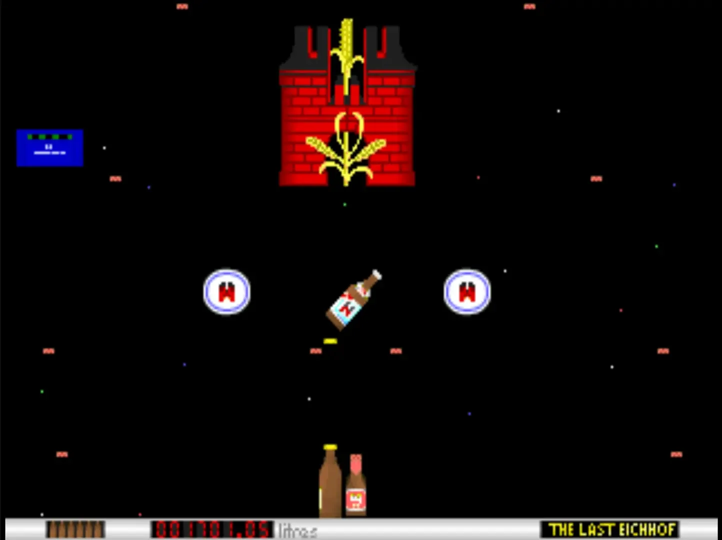 The Last Eichhof is a vertically scrolling shooter released in 1993 for DOS. In this game, the player controls a beer bottle and destroys bottles, beer glasses, cans, and other beer-related items. The game's name refers to a small independent Swiss brewery "Brauerei Eichhof". Since the game's code is in the public domain, it was later ported to Windows and Linux.