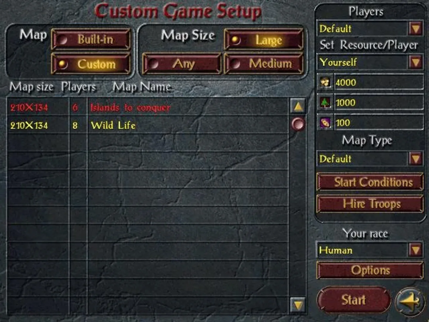 The game has three races to choose from: Humans, Elves, and Greenskins. Each race has its own characteristics and units just as is found in most RTS games. However, that's just the beginning. Your armies are always unique. Every single unit can gain up to five levels of experience and has its own inventory that can be traded between units. Inventory items include skill artifacts, keys, potions, spell scrolls, and more.
