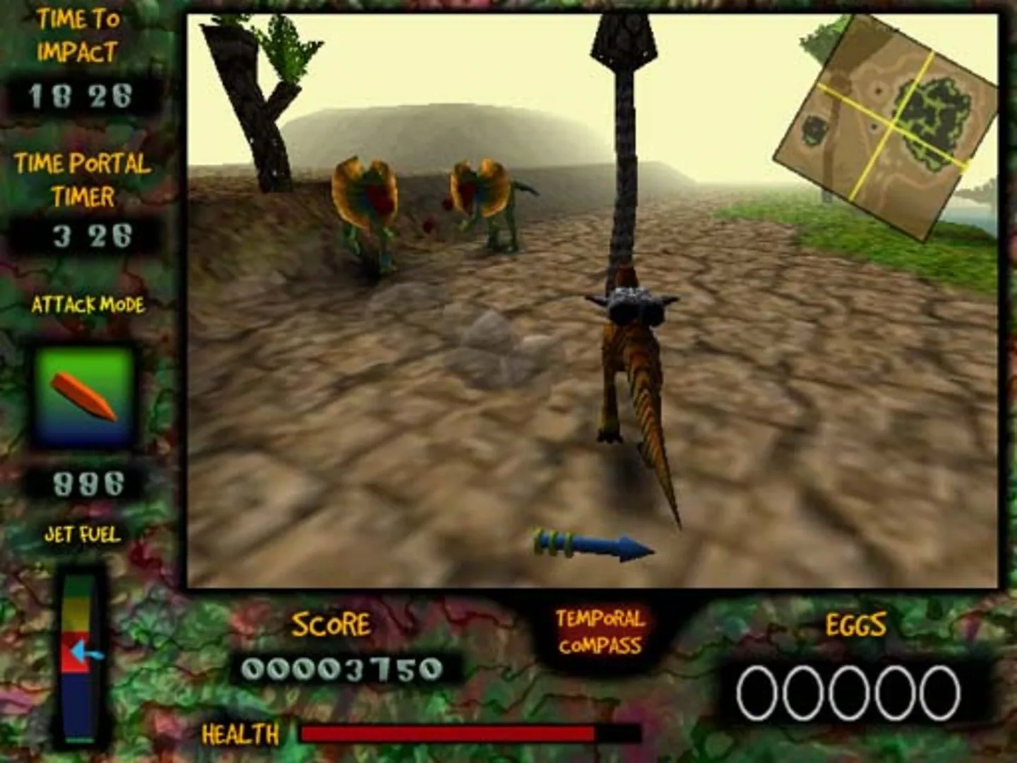 Nanosaur is a third-person action game. The player must find each of the five types of eggs and bring them to time portals. The location of the nearest time portal is always indicated by an onscreen "temporal compass" arrow. The Nanosaur can fly with his jetpack, but the amount of fuel is limited. Pickups with ammunition, health refills, and energy shields can be found strewn about, and fuel can be recharged by standing near gas fissures. For his defense against the wild dino populace, the Nanosaur is equipped with a "fusion blaster" weapon which has numerous attack modes, each using a different type of ammunition. Apart from the dinosaurs, the player must also watch out for other threats such as lava, rolling boulders, or spore shooting fungi.