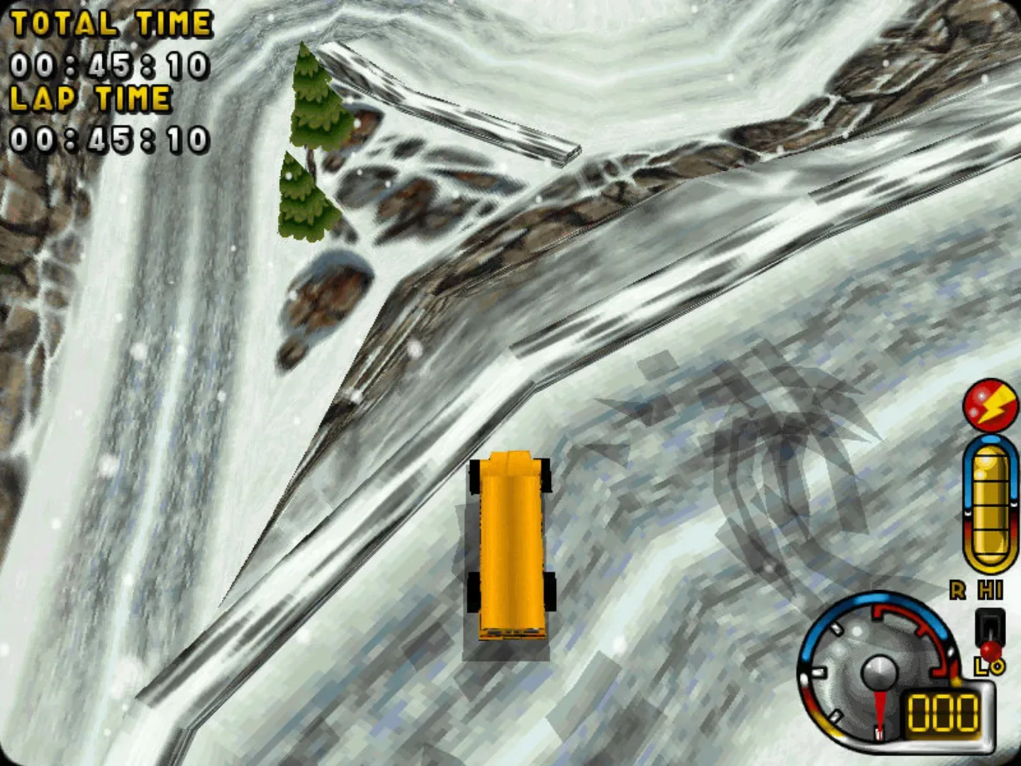 Ignition is an action packed racing game viewed from above and slightly behind the player. The cars on offer range from police car and VW Beetle to school bus and truck, each of which has its own strengths and weaknesses - trying to win with the bus, which involves blocking everyone behind the hideously slow vehicle for 3 laps, is perhaps the ultimate challenge. Initially there are 5 tracks available, with practice and single race modes as well as full championship at 3 levels - winning each of the first 2 levels unlocks an extra track. They all have hazards running through them, and sections where you must make a split-second choice between the safer route and the risky but potentially rewarding one. Multiplayer can be done via network or by split-screen - in a break with convention the screen is split vertically rather than horizontally.