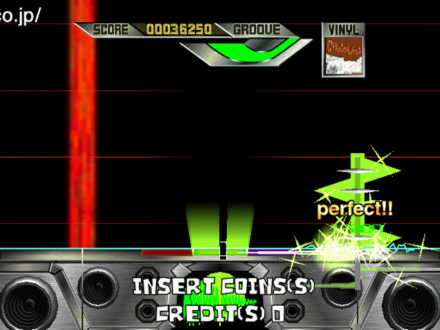 Crackin’ DJ is a DJ simulation machine where you have to scrach to the music. Your controls include 2 turntables and a fader. There are 20 songs including a lesson tune and 2 hidden songs. One of the bonus tunes is a remake of the « outrun » theme song. The « Beats » fall down in columns on the left and right side. When the beat hits the horizontal line, that is when you start scraching. The music is accompanied by animated videos that are shown in the background. The game is very « ghetto ». Most of the tunes are generic Rap and R&B songs created by « Hiro » from Sega’s music development team. Crackin DJ was only released as a dedicated cabinet in very limited numbers in Japan. There are less 5 than Crackin DJ machines in the USA as of July 2003.