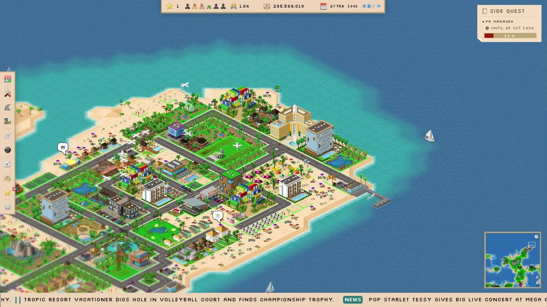Be the right businessman and build a unique holiday paradise. Become rich and enlarge your paradise. But be on the lookout for your competitors and the unpredictable weather. Summer Islands – In this diversified economic simulation you have the possibility to build an indescribable holiday paradise. Build cottages, villas or expensive hotels, right on the beach or in the mountains. When a building has been completed, the tourists can come by boat or plane. Then the difficulty begins: build bars, discos, golf courses, supermarkets and many other buildings, which are popular by the tourists and let you as the owner become rich. But do not forget their surroundings. The many catastrophes that can occur and your enemies who also want to depend on the cake. You should always keep an eye on your vacation paradise.