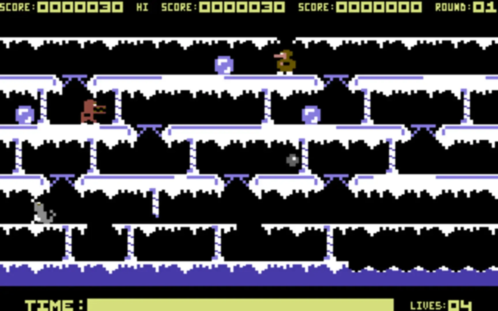 Ice Hunter is a single screen platformer where you play the role of Thorak the Eskimo, Prince of Ice, who is searching for blocks to make a special igloo. Finally in his search, Thorak has found a multi-level cave containing the blocks he needs for the igloo, so enters to retrieve them. The only way to get the blocks to his site for the igloo is to get two blocks, one at a time to a stream at the bottom of the cave, then stand on them to float down the stream. The main problem though is the creatures that move around the screen and these have to be avoided or if touched he loses one of four lives. The creatures though can be killed by dropping a block on top of them or allowing them to fall through the gaps. A bird that occasionally appears can be killed if its flight path is blocked. To get the blocks to the bottom of the screen there are platforms over gaps and to get a gap Thorak can walk on the platform to remove it then drop blocks through the gap to the level below. Thorak can't fall through the gaps or he is killed but there are pillars that can be climbed up or down. At a certain level in the cave, Thorak can't get back up so he has to make sure he has two blocks to move to the stream. A power-pill can be collected and these stuns the creatures which can be touched to remove them. Once the blocks are floated away then it's off to the next cave with more creatures and the levels start to scroll slowly to the left and appear again on the right of the screen.