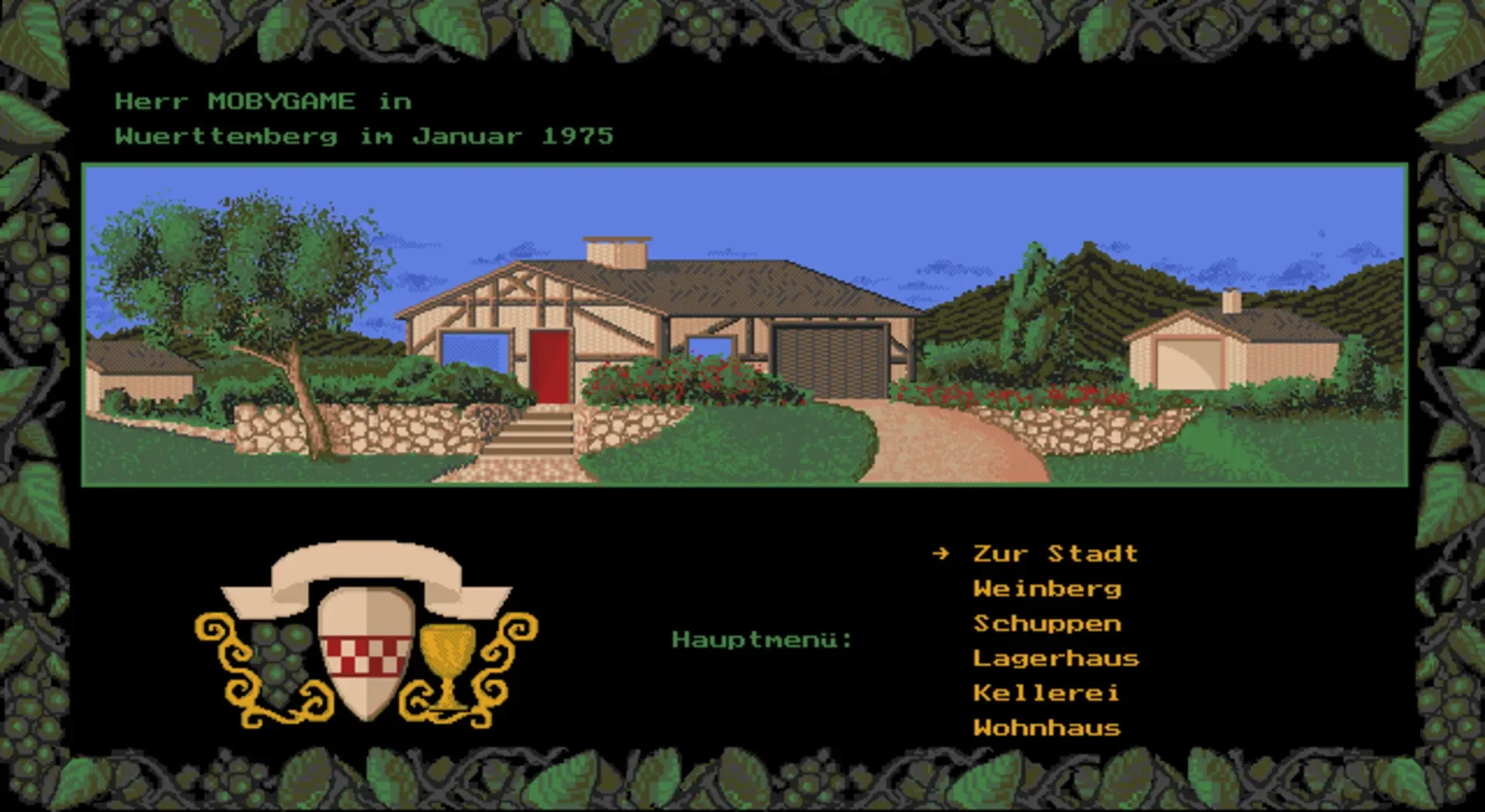 Winzer (German for vintner) is a business simulation about the cultivation of wine. Choose a vineyard in southern Germany, cultivate and harvest grapes, press wine and sell it on the national or international markets. The quality of your wine depends on the type of vines, when the grapes are harvested and how they are fertilized. You must deal with hiring personnel and buying equipment, registering your wines with the authorities and advertising your products. You can also sabotage your competitors or illegally water down your wines. You win by reaching a score of 1000 points. Points are awarded by registering wines, creating high quality sparkling wines or placing high in regional or national wine competitions.