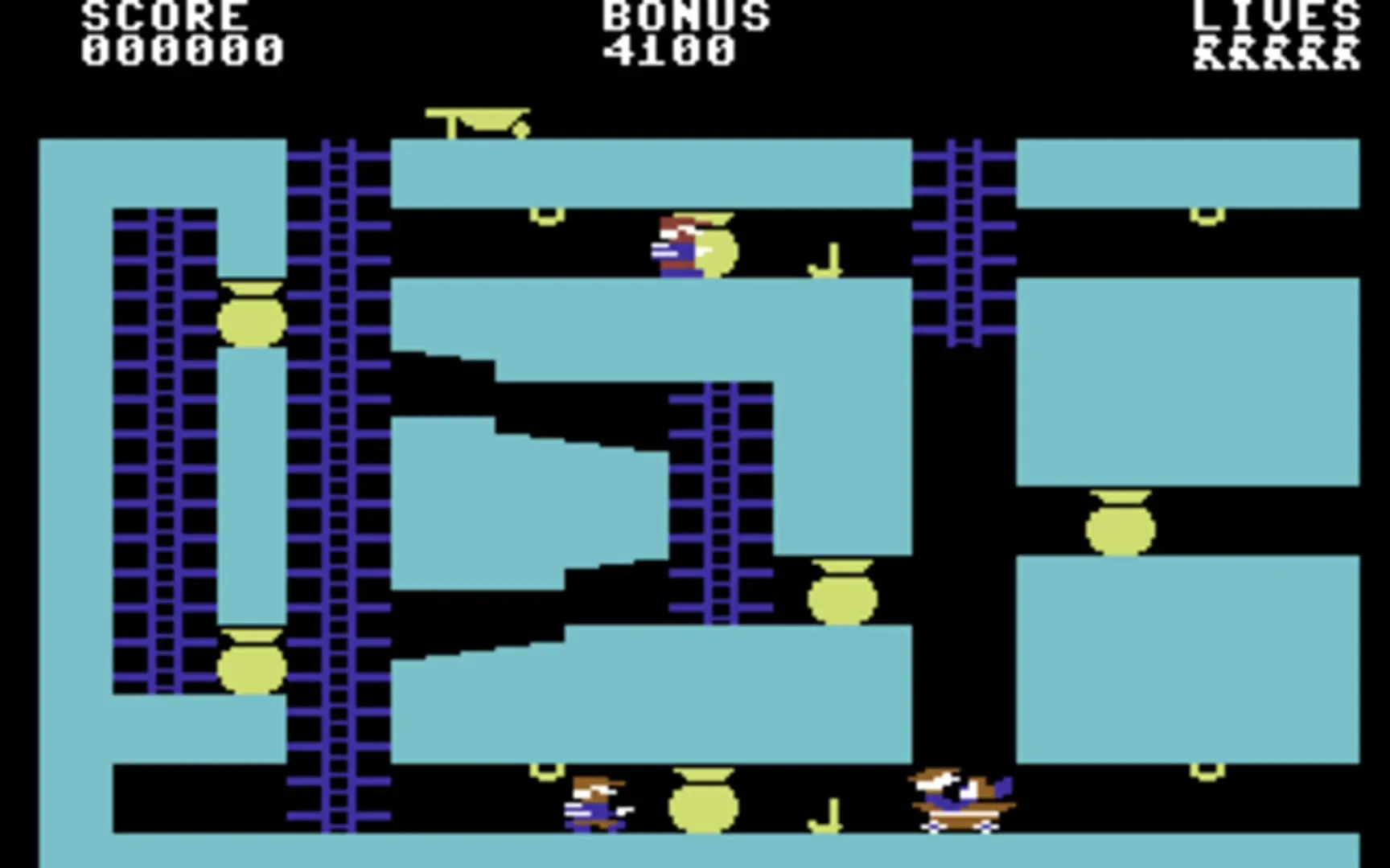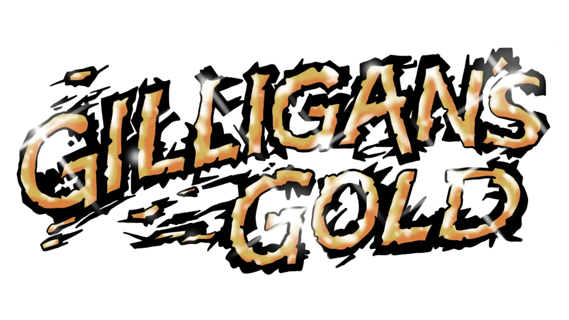 Gilligan's Gold is a flick-screen platform game based on the arcade game Bagman consisting of three screens as you try to negotiate various levels of a mine to collect all the bags of gold scattered around the three screens. Trying to stop you are a couple of outlaws and if you touch one then you lose one of five lives. You must use the ladders and lifts to move up and down levels and if you fall down more than one level then you lose a life. Once you have a bag of gold you must drag it up to the top of the mine and put it in your wheelbarrow which can be moved anywhere on the top of the mine on any screen. Dragging a bag of gold slows you down but can be used to drop on the head of an outlaw. You can use a pick axe to dig through a yellow wall hiding a bag of gold and it can also can stun an outlaw for a few seconds but can only be used once. Moving about the screens are mine-carts and although if they hit you, you lose a life but you can ride them. Grab onto a hook and when a cart is beneath you drop on it. You can get off a cart at anytime.