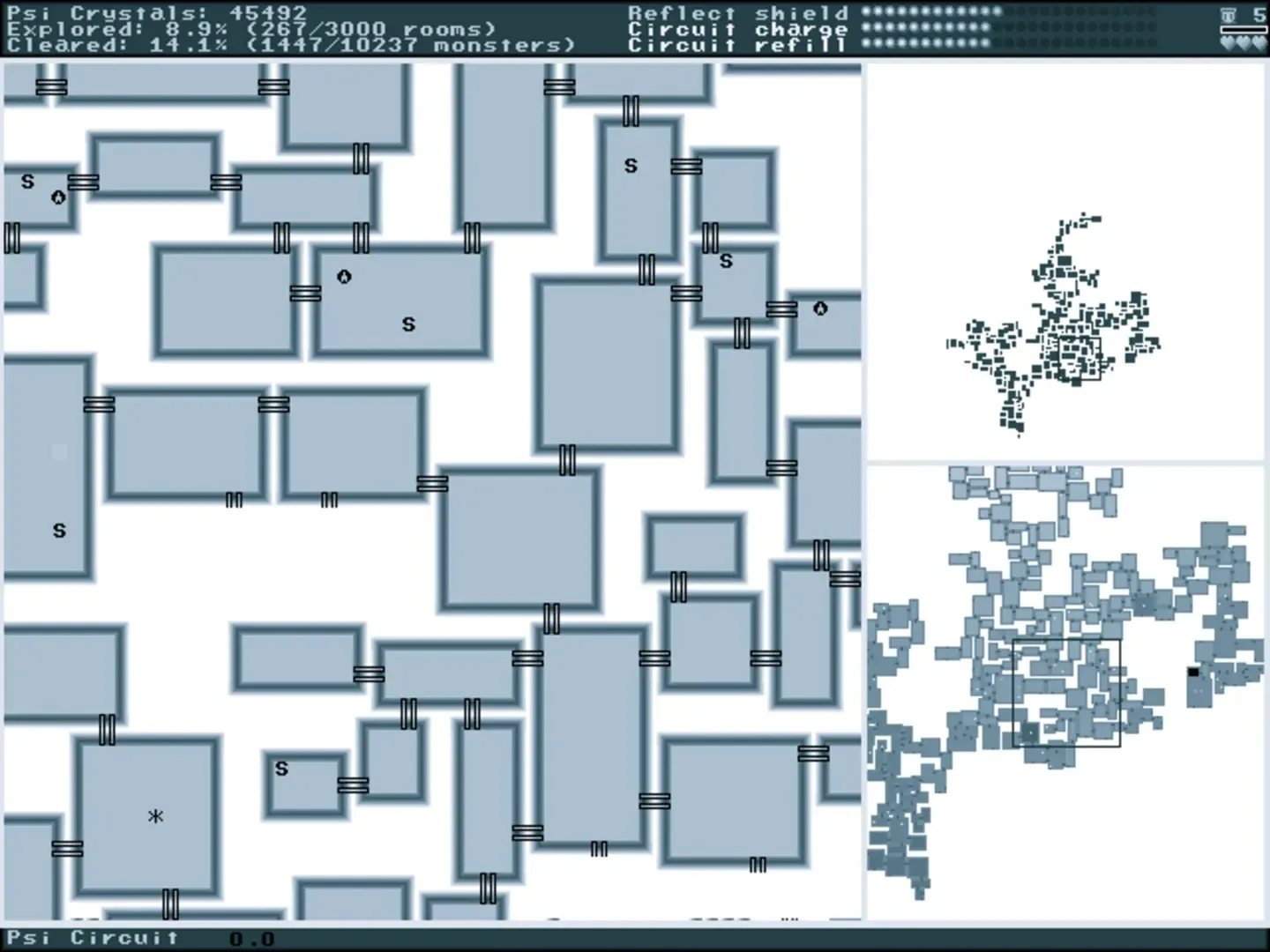 Meritous is an independently-made PC game, a cross between a top-view dungeon crawler and a bullet-hell shoot-em-up. In it, you control main character Merit, who travels through an enormous 3000-room labyrinth, the Orcus Dome, in order to find three artifacts called the PSI Keys, and restore them to their proper locations. Although enemies fire copious amounts of bullets at you, you don't shoot back- instead, you have an attack called a PSI Circuit, which you charge up to unleash a shockwave that hits enemies and nullifies their shots. As you charge up the PSI Circuit, target reticules appear on nearby enemies, the circle indicating they're in range, and the cross indicating you've charged up enough to damage or kill them. You can't just use the PSI Circuit as often as you want, though. After releasing it, there's a cooldown time before you can charge up again, and the longer you charge up, the longer you have to wait. Destroyed enemies leave behind PSI crystals you can use to upgrade three facets of your PSI Circuit- Circuit Charge (charge up faster), Circuit Refill (less cooldown time), and Reflect Shields. When you have at least one level in Shields, a barrier is projected around Merit, which will deflect one bullet per shield level, before having to regenerate. As you upgrade Shields, the barrier becomes bigger, then shows multiple layers as it gets stronger.
