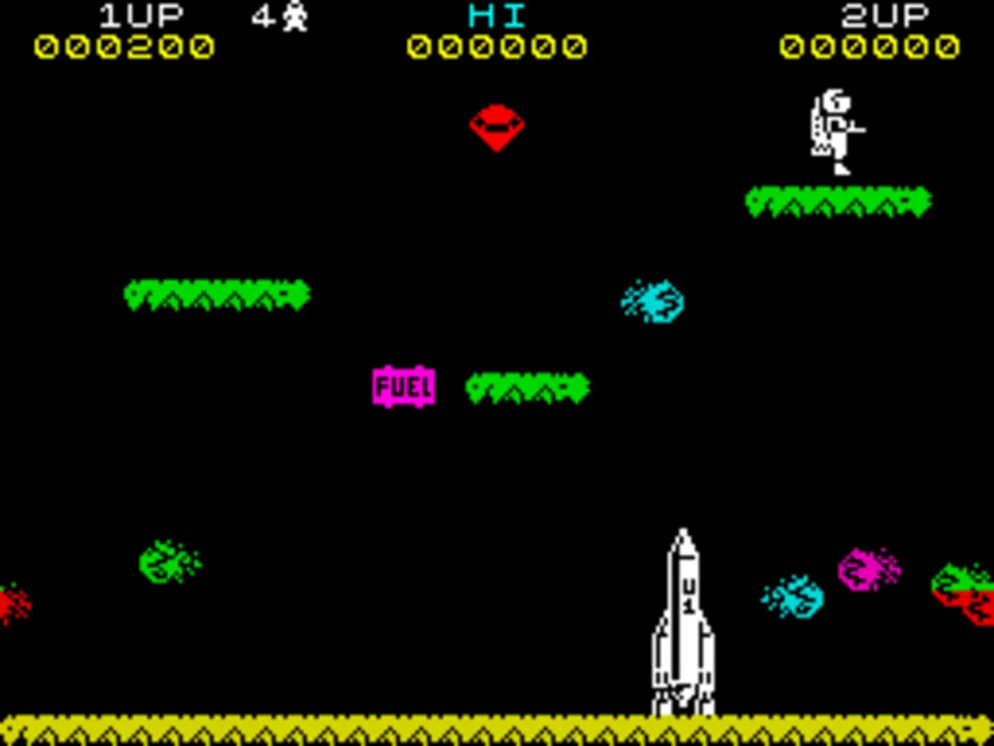 The 'Acme Interstellar Transport Company' is delivering spaceship kits to various planets in the solar system throughout the Galaxy; and as chief test pilot, all you have to do is assemble the Rockets, and thrust on to your next destination. As you don't often get the chance of a free trip across the Galaxy, this is a great opportunity to get rich! Stop off on several planets on your journey, collect the odd sack of precious gems, elements or gold, and take them back with you. Sounds simple doesn't it! But before you make yourself the richest person in the whole Universe, remember to refuel your Spaceship - with 6 fuel pods - every time you land on a planet. Any other goodies you collect are yours to keep. Upon landing, you will find yourself equipped with the very latest Hydrovac Jet Pac, which can automatically air lift almost any rocket stage, fuel pod or valuables that you care to land upon, and release them over the rocket ship base. Don't forget your mega-powerful, Quad Photon Laser Phasers can blast any nasty, mean aliens who might object to your visit.