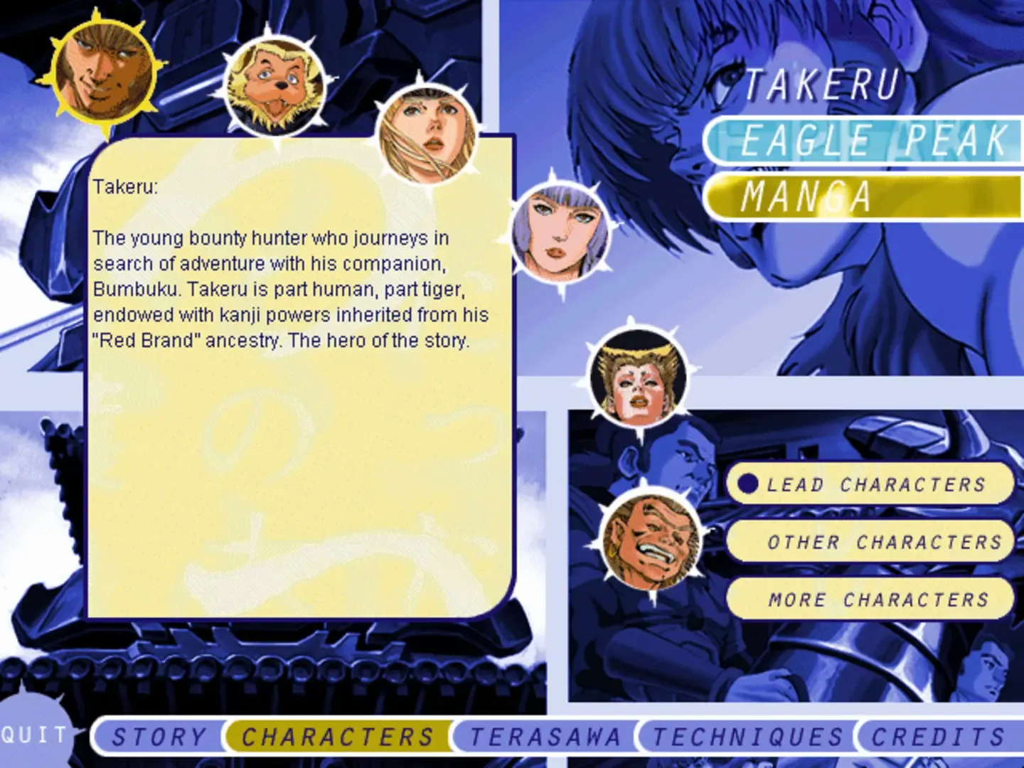 Created by artist Buichi Terasawa, Takeru is a full-color computerized interactive manga. Follow the hero Takeru Ichimonji in his battle against an evil sorceress in the land of Yamato, sort of an amalgam of feudal and futuristic Japan. Interaction consists of scrolling the mouse to uncover voice-over and action events, making choices that affect the direction of the story arc, and a few object-based puzzle games. Three chapters of the comic span 2 CD-ROMs, with over 50,000 frames of digital animation. Features a fair amount of violence and, of course, scantily clad female characters.