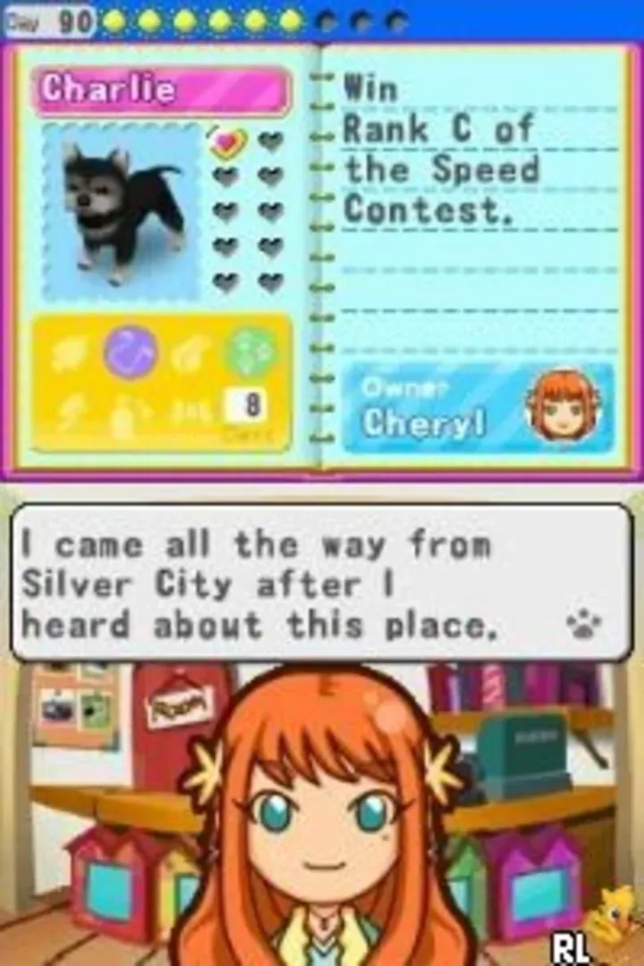 In My Pet Shop, the player takes the role of a young girl who just moved from Gold City to Green Town with her mother. As in this town, nobody owns a pet, her mother decides to open a pet shop. The player will help at the pet shop by helping the customers with various tasks, such as finding a pet, or taking care of one (walking, bathing, entering contests, etc.). To find a pet, the player will first need to gather information, and go outdoors to find and befriend animals. Animals, and sometimes items, are found by moving the stylus in specific places. Once an animal is found, an exclamation mark appears and it will come out, and the player can now try catching it. To do so, food and various items will be used. Some strategies, such as waiting a few turns for a shy animal to approach by itself may also be needed. When a task is done, the player will get an allowance.