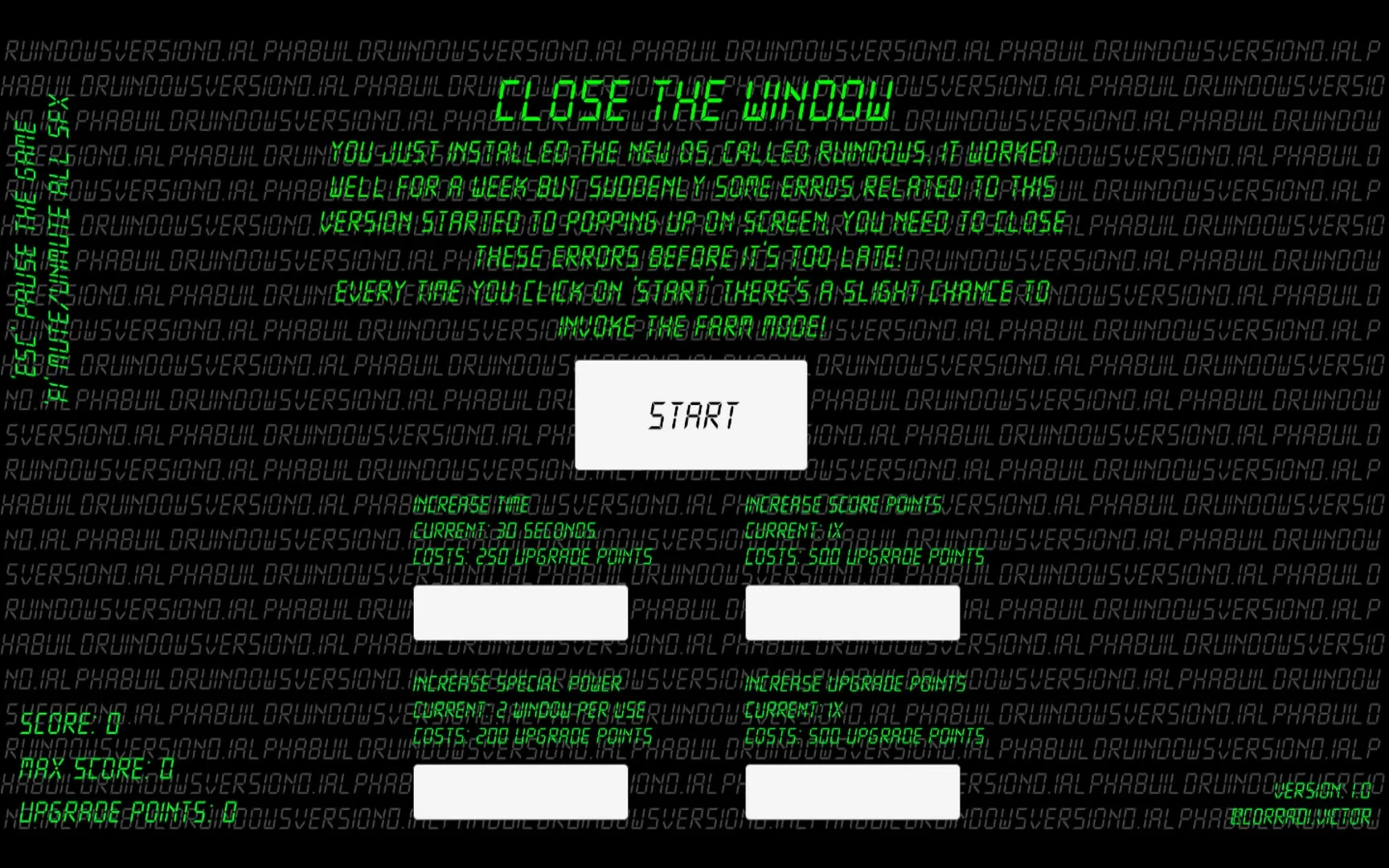 Close the Window You just installed the new OS, called Ruindows. It worked well for a week but suddenly some erros related to this version started to popping up on screen, you need to close these errors before it's too late! Every time you click on 'start' there's a slight chance to invoke the farm mode!