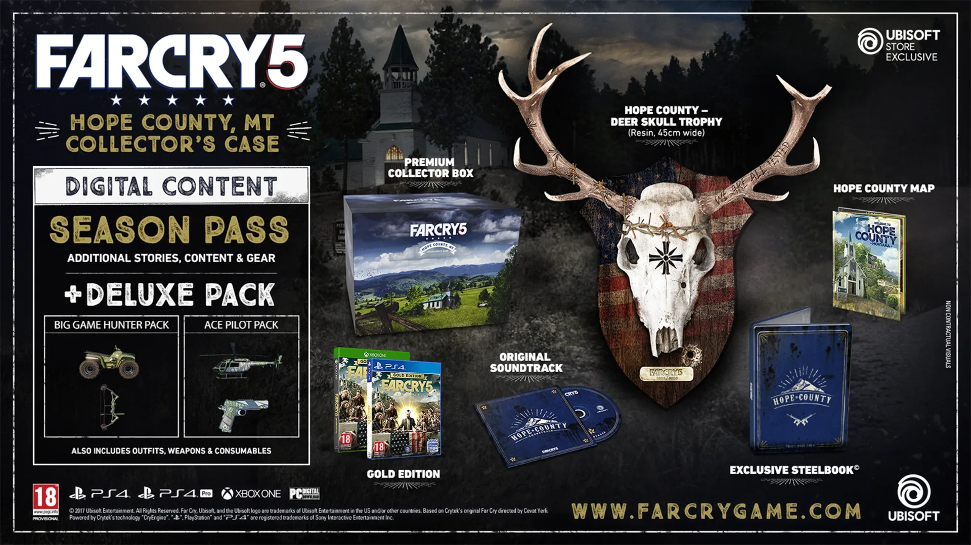 Far Cry 5: Hope County - MT Collector’s Case includes: FAR CRY 5 GOLD EDITION Exclusive Collector’s Case: Limited Hope County Deer Skull Trophy customised with a unique Far Cry 5 design. Highly detailed and made with high quality resin (around 45cm wide - numbered 1 to 6000). An exclusive Steelbook. A double-sided tourist map of Hope County featuring point of interest and key locations. The Original Soundtrack of the Game.