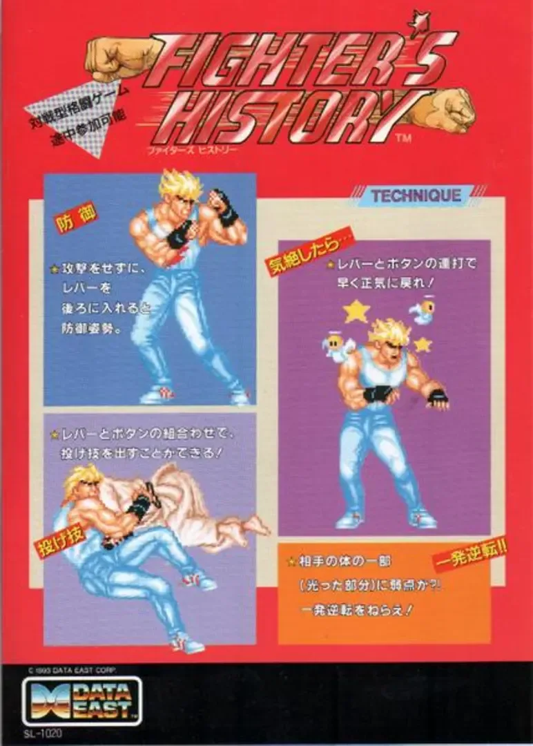 Fighter's History is a 1993 arcade fighting game developed and published by Data East. It's the inaugural game in the Fighter's History series. The main unique feature of the Fighter's History is its weak point system, which allows the player to temporarily stun an opponent by repeatedly hitting their weak point. Fighter's History became infamous for being the subject of a lawsuit against Data East by Capcom, who claimed the game is too similar to its hit title, Street Fighter II, and as such is copyright infringement on its property. The case was found in Data East's favor however, as the court found that the copied elements were scenes a faire, elements necessary for depicting the scenario. The game was later ported to the Super Nintendo Entertainment System in 1994, and followed by a sequel Karnov's Revenge for Neo Geo. There are three different gameplay modes are available. CPU Battle is the traditional arcade mode, where the player select a character and try to complete the game by beating all of the other fighters. In survival mode, the player select a team of five characters to go up against another team. And finally versus mode, where the player can go up against his friends.