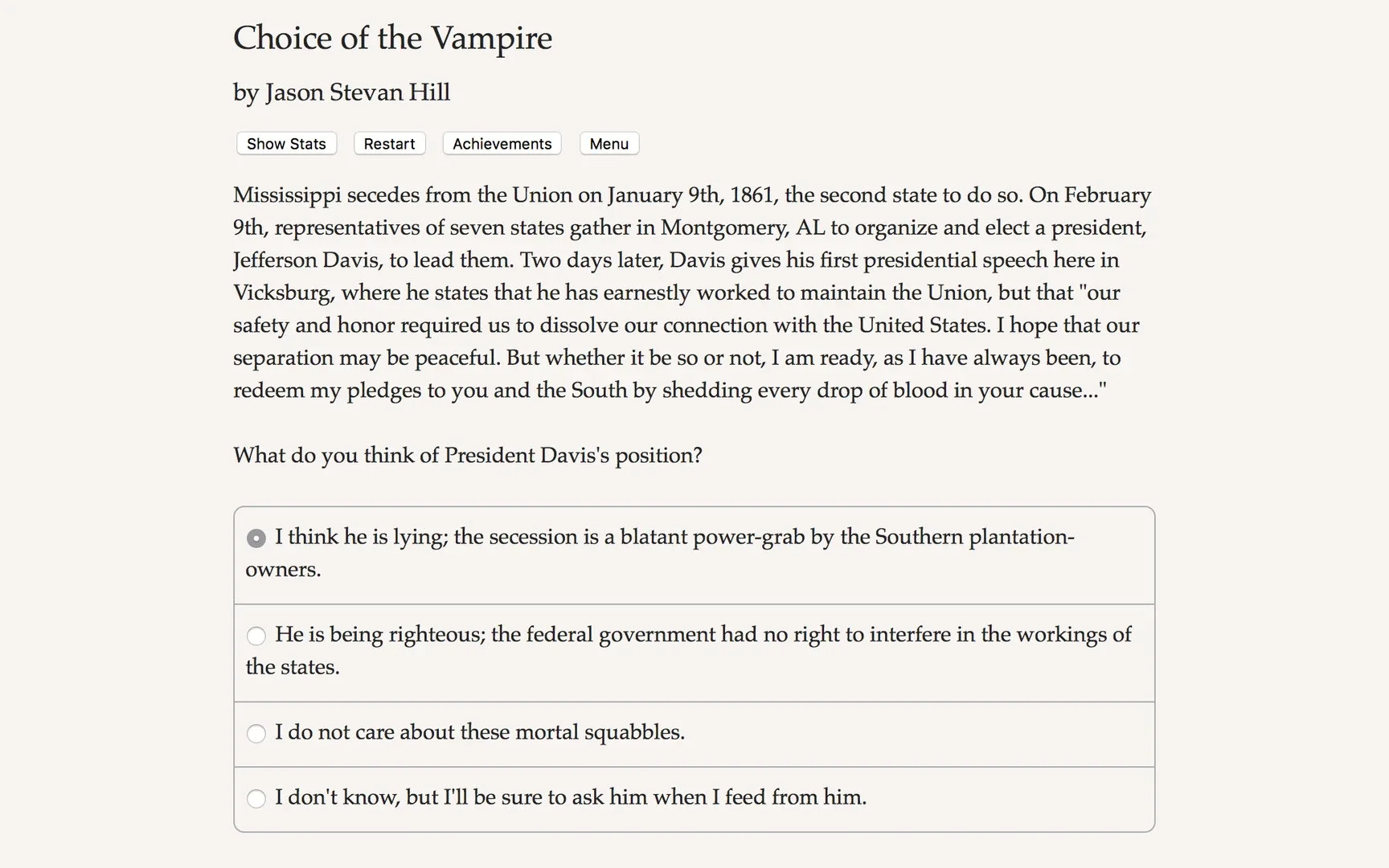 Begin your two-hundred-year journey as a vampire in New Orleans, 1815; choose whether you will seek love, power or redemption as you negotiate the growing-pains of the young Republic.