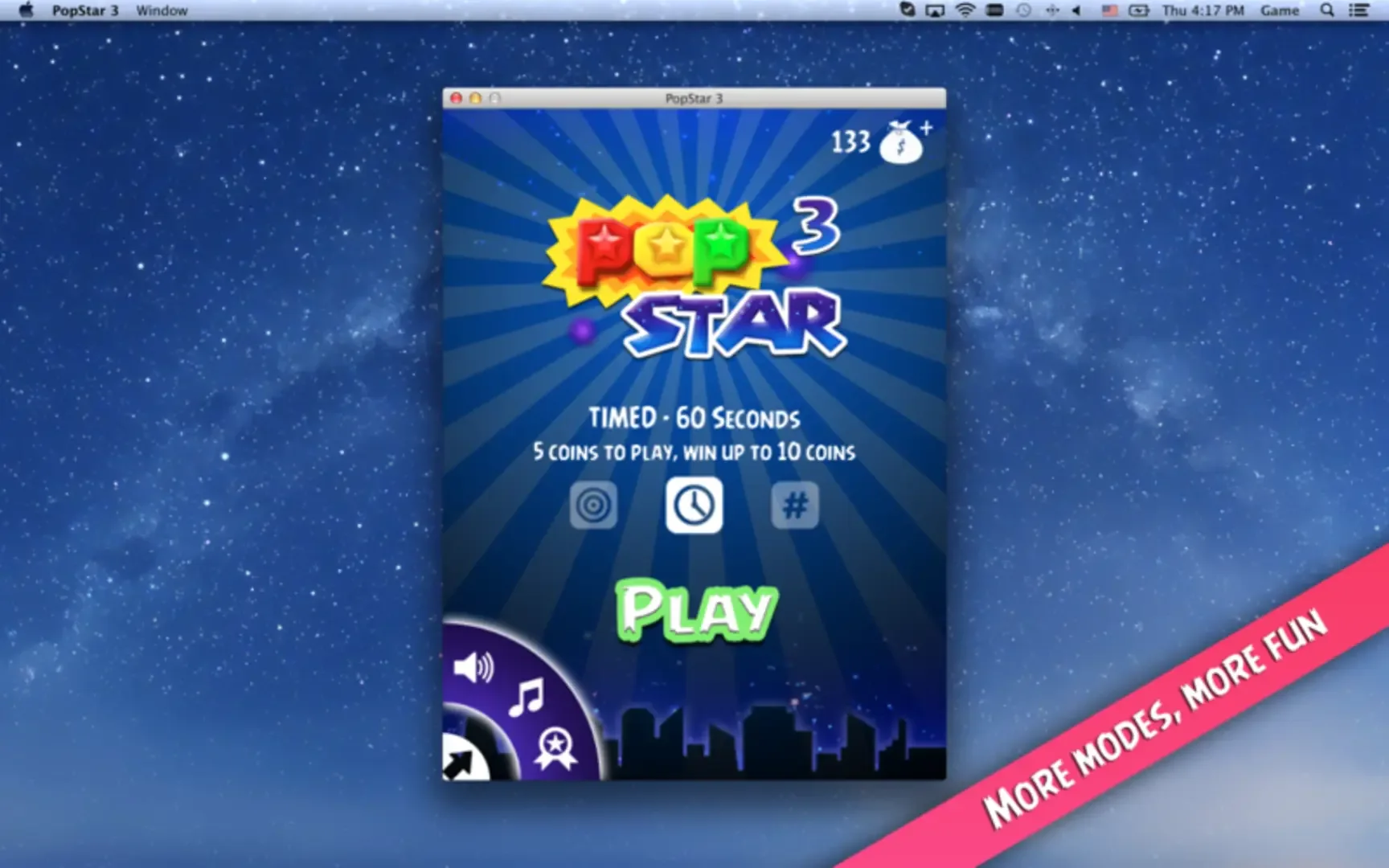 Beware, once you pop, you can't stop! The all time favorite puzzle game was played on millions of touch screens everyday. Now, are you ready to try it on your Mac? For the first time, we are introducing 3 game modes to make it fun for everyone. - Classic mode: meet the target score for each stage - Timed mode: do your best in 60 seconds, and earn coins - Moves mode: limited 30 moves, take your time and make the best moves Choose your preferred control mode, game mode and musics. Make use of the bonus items to get higher scores and challenge world records. Share your score to varies social networks. Challenge your friends. Let's pop! Let's have fun.