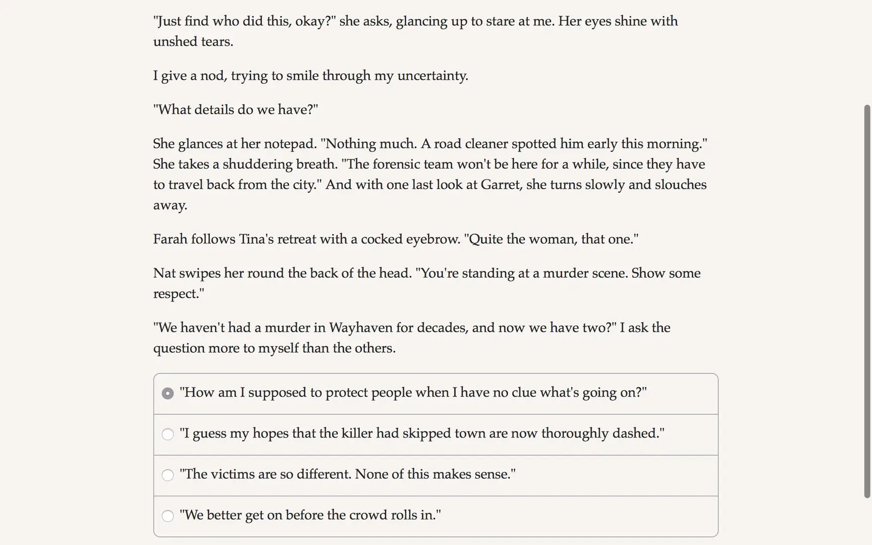 Play as a detective on your first case in the small town of Wayhaven, opening your eyes to a world bigger than you thought. Totalling 440,000 words, this supernatural romance interactive novel allows you to pick your gender (female, male, or non-binary) and orientation (straight, gay, or bisexual). Choose which detective skills you will focus on - deduction, combat, science, or people skills. Use multiple dialogue options to express your personality and define your relationships with friends, family, and enemies. Start a romance with one of the vampires of Unit Bravo, to be developed over a 7 part series.
