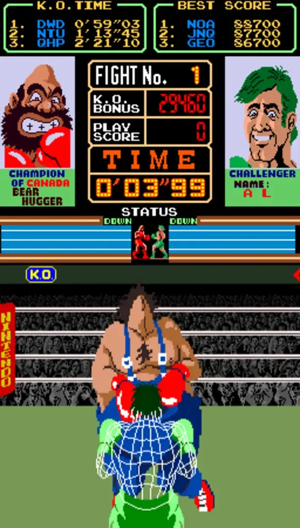 The original Arcade release of "Super Punch-Out!!". This is a boxing game where you attempt to defeat five different champions, Bear Hugger, Dragon Chan, Vodka Drunkenski, Great Tiger and Super Macho Man. If you defeat all five, you become the champion and defend your title against the same five characters.