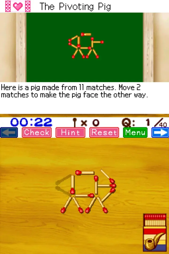 The aim of the Matchstick Puzzle by DS is to answer the questions by moving or rotating matchsticks. There are more than 150 puzzles of four difficulty settings to complete. The game also has hints to help the player decipher the more abstract clues.