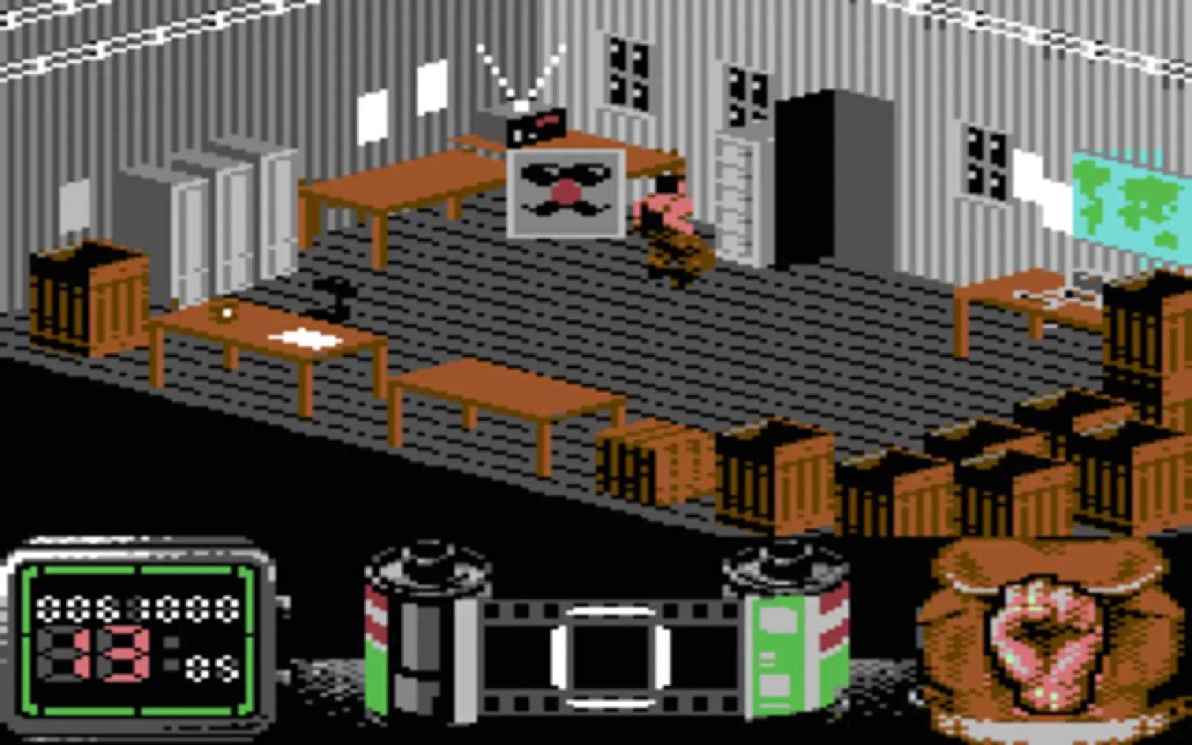 The gameplay could be compared with the Last Ninja series. It has an isometric view and is flick screen. You can pick up useful items like weapons (knives, and guns), which blink when you enter a screen containing such an item, as well as the evidence needed to complete each stage. Any collected evidence is shown on a camera film reel. Once all the evidence is collected on a stage then the game changes to a driving game where you have to get to the next stage. The car is viewed from behind and you must avoid the other vehicles as well as helicopters dropping bombs but your car is armed with a cannon and missiles. Police cars have to be avoided or they will ask to see any evidence you have.