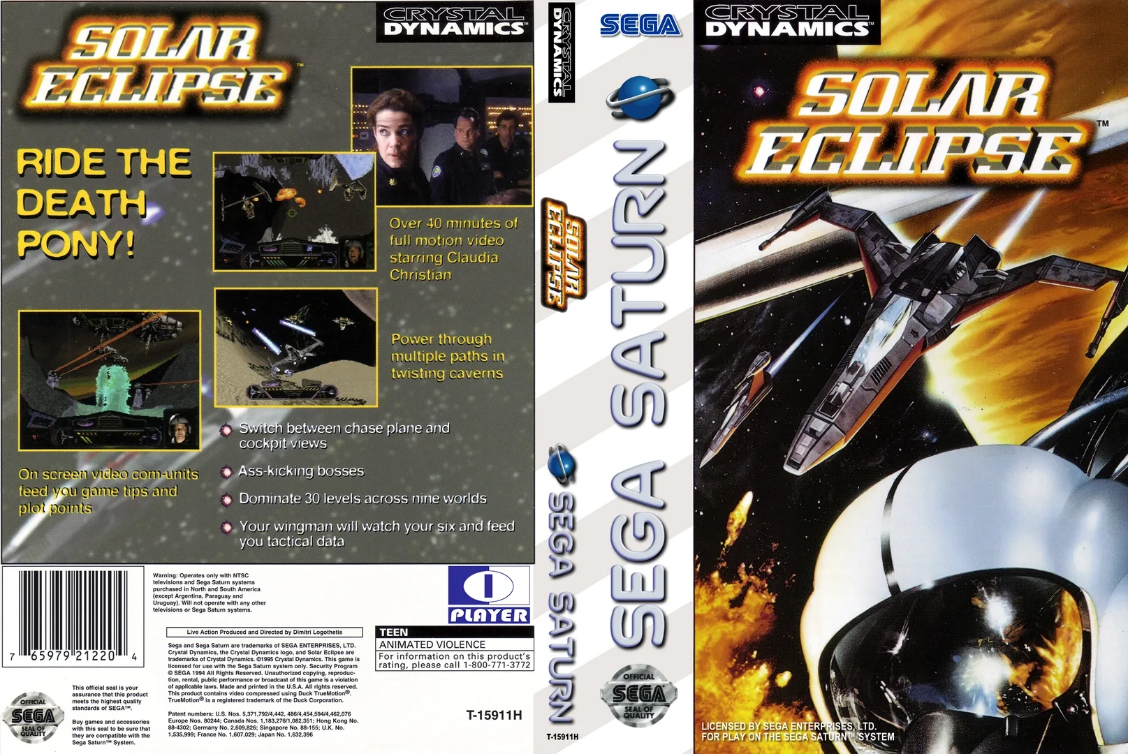 Solar Eclipse is a 3D shooter that takes place on and near the many moons of Saturn. You are a hot-shot pilot with a troubled past. You've been re-assigned to a new squadron aboard a Tomlinson-class carrier. There's trouble on a mining colony on the moon Janus. Your squadron is sent in to investigate, and uncover a lot more than they went looking for. The story in this game is told through a series of full-motion video clips. In addition to between-level scenes, FMV messages from your squad mates appear from time to time while you play the game.